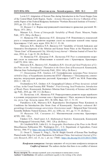 17. Овчинникова Н.Ф., Гриднев А.Н. Географические культуры Pinus koraensis siebold et Zucc. в Уссурийском лесничестве КГКУ “Примлес” // Плодоводство, семеноводство, интродукция древесных растений. Красноярск: СибГУ им. М.Ф. Решетнёва, 2018. С. 108-112.