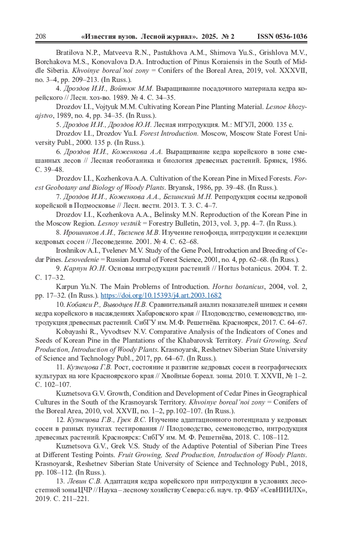 7. Дроздов И.И., Коженкова А.А., Белинский М.Н. Репродукция сосны кедровой корейской в Подмосковье // Лесн. вестн. 2013. Т. 3. С. 4-7.