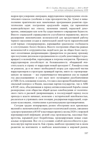 3. Скубко Ю. С., Сидоров В. А. ЮАР через четверть века после ликвидации апартеида // Азия и Африка сегодня. № 11.2019.