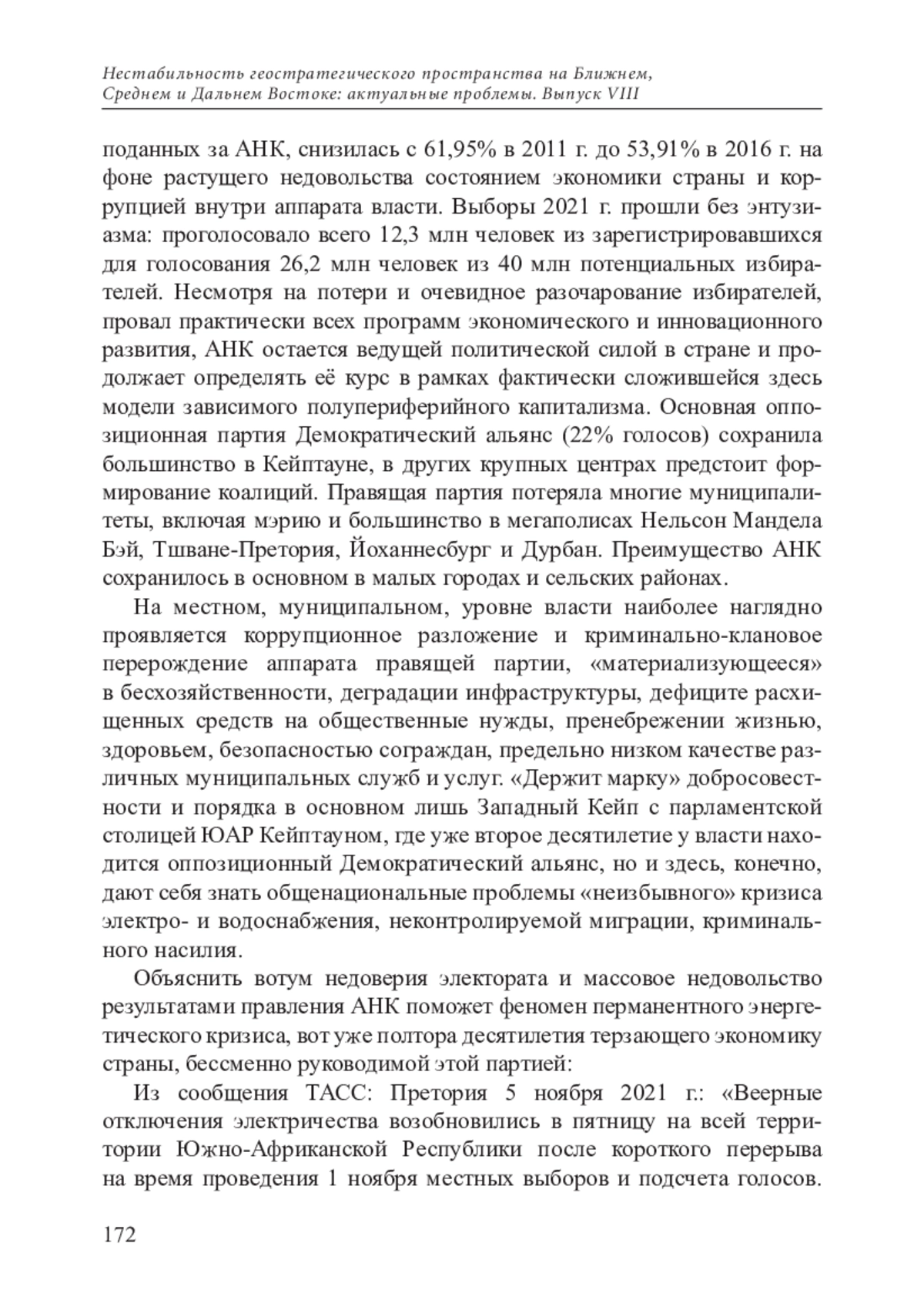 На проведенных 1 ноября 2021 г. в ЮАР местных выборах депутатов законодательных и муниципальных собраний всех уровней во всех провинциях страны правящий Африканский национальный конгресс (АНК) впервые в 27-летней истории постапартеидной демократии не сумел получить поддержку большинства избирателей (46% голосов). На местном, муниципальном, уровне власти наиболее наглядно проявляется коррупционное разложение и криминально-клановое перерождение аппарата правящей партии, «материализующееся» в бесхозяйственности, деградации инфраструктуры, кризисе энерго- и водоснабжения, дефиците расхищенных средств на общественные нужды, пренебрежении жизнью, здоровьем, безопасностью сограждан, предельно низком качестве различных общественных служб и услуг, росте бедности и безработицы. Несмотря на потери и очевидное разочарование избирателей, снижающуюся поддержку от выборов к выборам, провал практически всех программ экономического и инновационного развития, АНК пока остается ведущей политической силой в стране. Основная оппозиционная партия — Демократический альянс — сохранила большинство в Кейптауне, в других крупных центрах предстоит формирование коалиций. Правящая партия потеряла большинство в крупных мегаполисах, сохраняя преимущество в основном в малых городах и сельских районах. Очевидный вотум недоверия избирателей делает проблематичным сохранение АНК парламентского большинства на предстоящих общенациональных выборах 2024 г., тем более, что партия глубоко погрязла в межфракционных и коррупционных скандалах и склоках и не демонстрирует способности к консолидации и самоочищению.