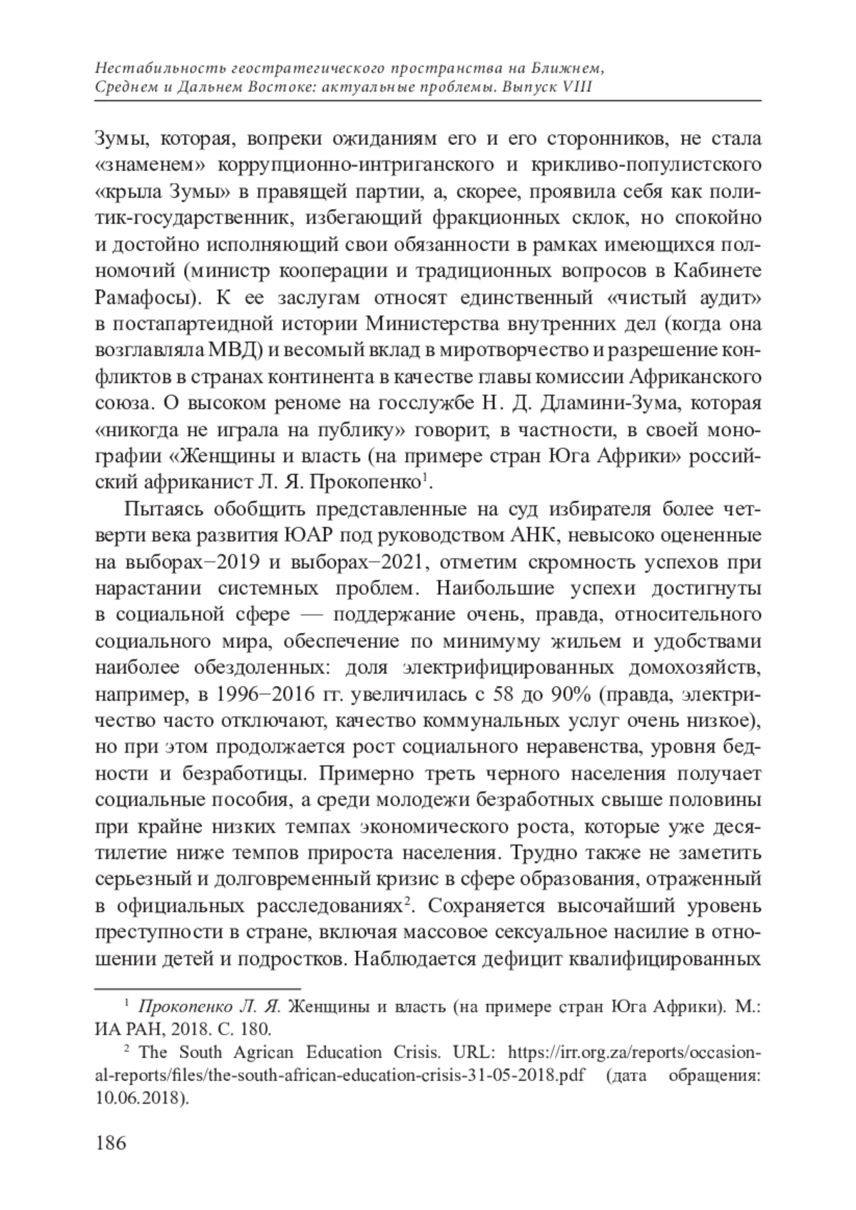 1. Прокопенко Л. Я. Женщины и власть (на примере стран Юга Африки). М.: ИА РАН, 2018. EDN: YNPCDJ