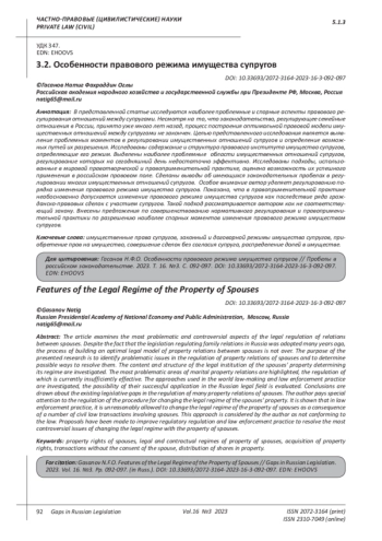 Baranova E.I. The legal regime of the property of spouses// Bulletin of Tver State University. Series: Law. 2022. No. 1 (69). pp. 225-228. EDN: NQERCR