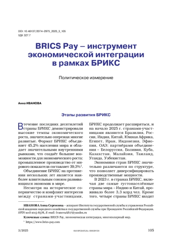 В статье анализируются предпосылки создания BRICS Pay и политические аспекты её функционирования. Особое внимание уделяется снижению зависимости от доллара США и западной финансовой системы, укреплению политического влияния объединения БРИКС на мировой арене, формированию альтернативного финансового пространства.