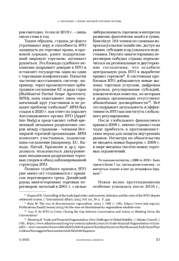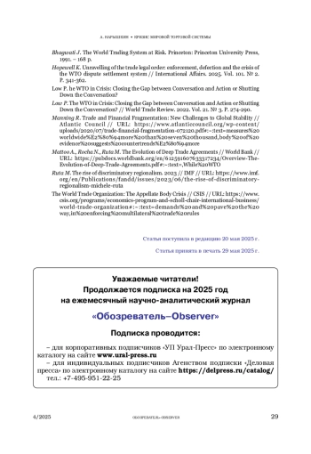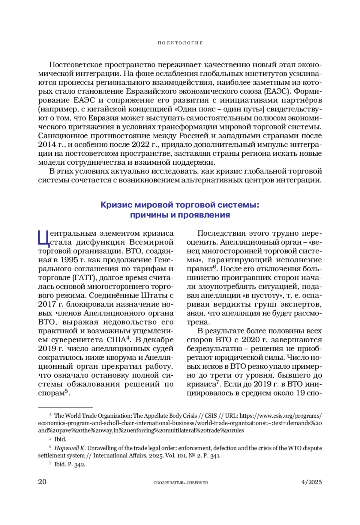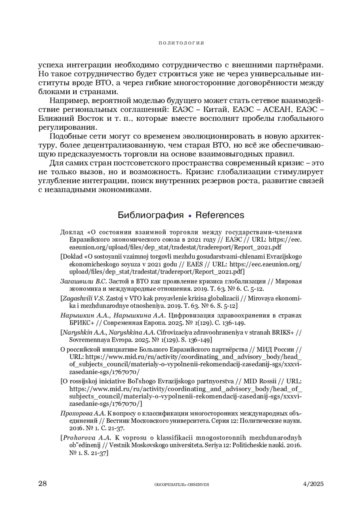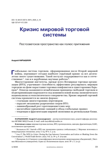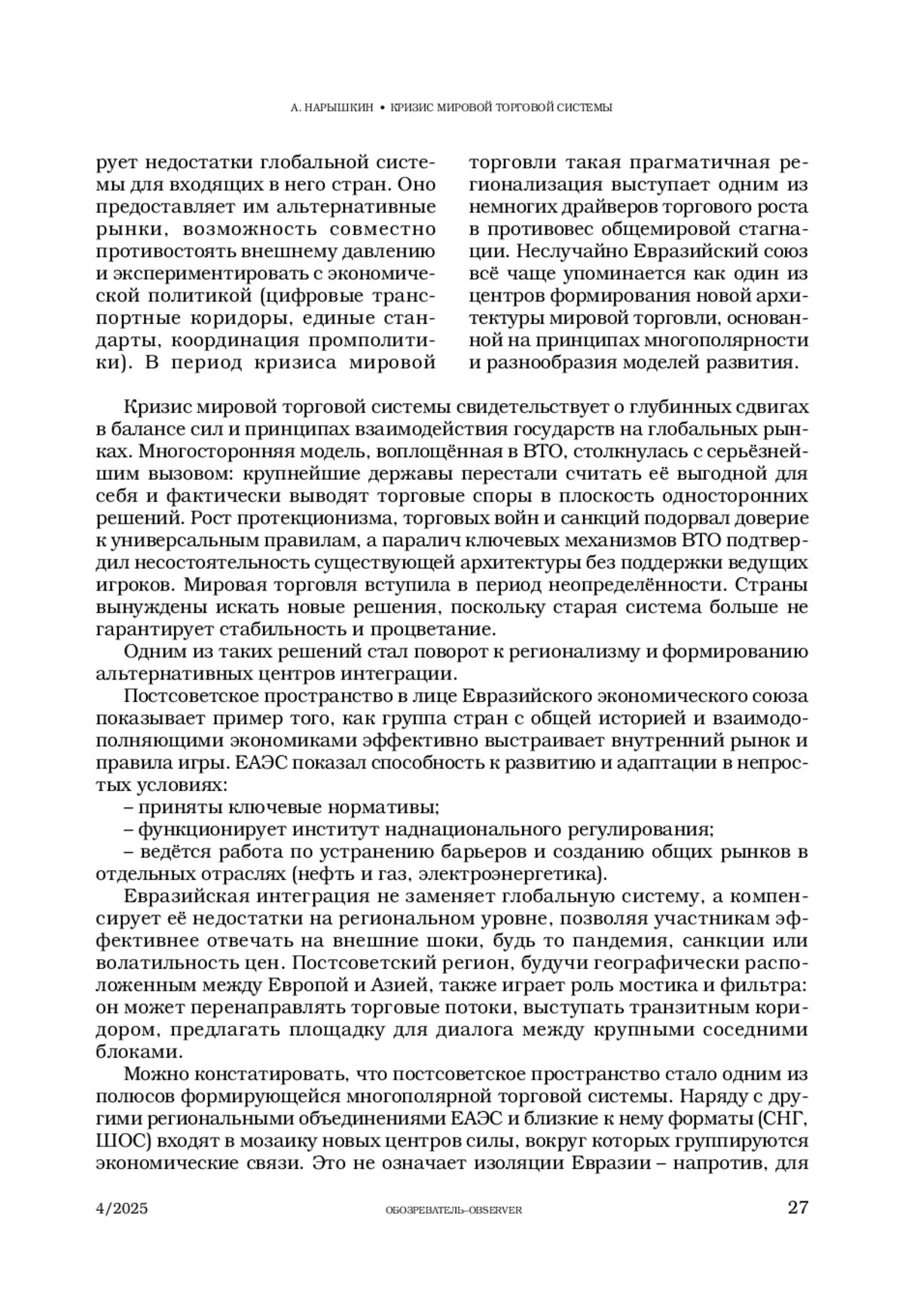 НАРЫШКИН А. А. КРИЗИС МИРОВОЙ ТОРГОВОЙ СИСТЕМЫ // ОБОЗРЕВАТЕЛЬ. 2025. № 4