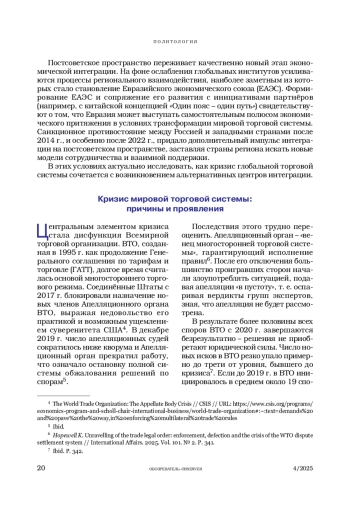 В статье рассматривается современный кризис глобальной торго­ вой системы и роль постсоветского пространства как альтернатив­ ного полюса политико-экономического притяжения. Анализируются причины кризиса, включая блокировку механизмов ВТО, усиление протекционизма и фрагментации мировой экономики.