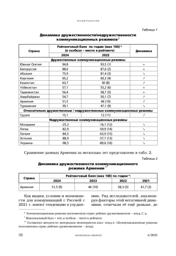 В статье представлены результаты мониторинга дружественности коммуникационных режимов постсоветских стран, в частности Армении, а также особенности репрезентации России в армянском дискурсе, описываются выявленные противоречия и расколы в армянском обществе.