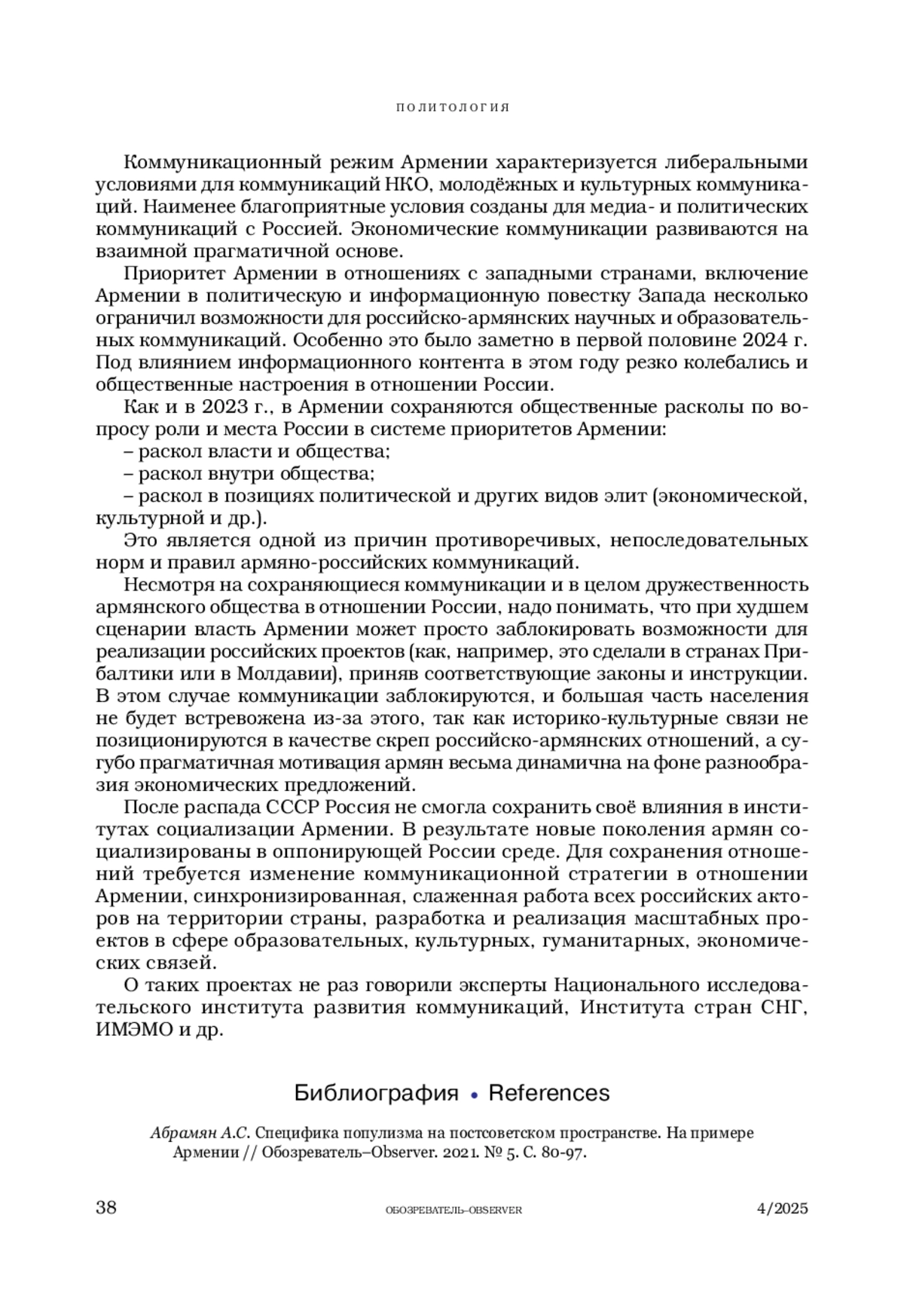 1. Абрамян А.С. Специфика популизма на постсоветском пространстве. На примере Армении // Обозреватель-Observer. 2021. № 5. С. 80-97.