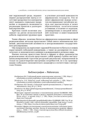 В статье рассмотрена политика Китая по редкоземельным металлам в Африке как элемент его глобальной стратегии обеспечения доступа к критически важным ресурсам. Анализируются значимость редкоземельных металлов для высокотехнологичных отраслей, инвестиционные механизмы КНР, модель «ресурсы в обмен на развитие» и взаимодействие с африканскими государствами.