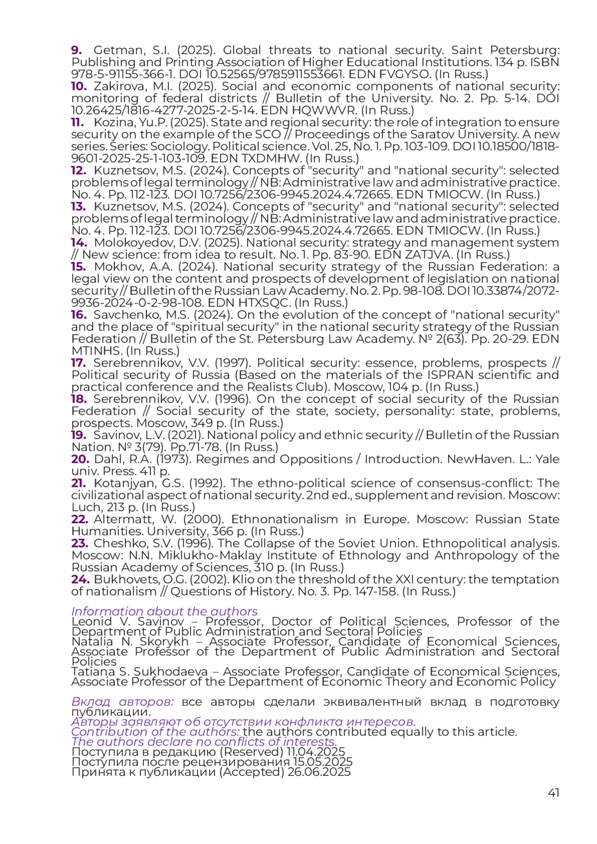 19. Савинов Л.В. Национальная политика и этнобезопасность // Вестник Российской нации. 2021. № 3(79). С. 71-78.