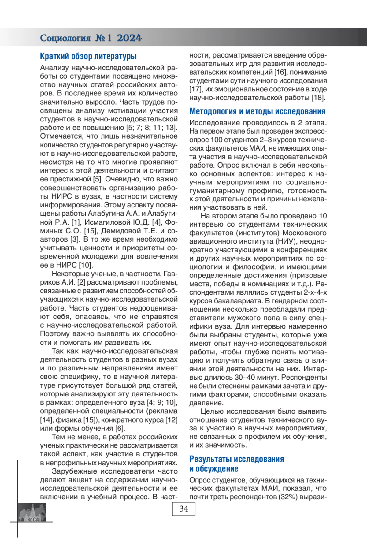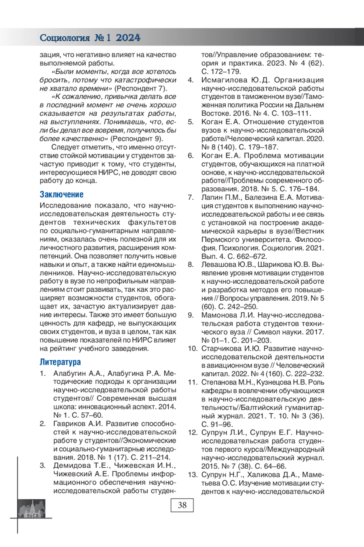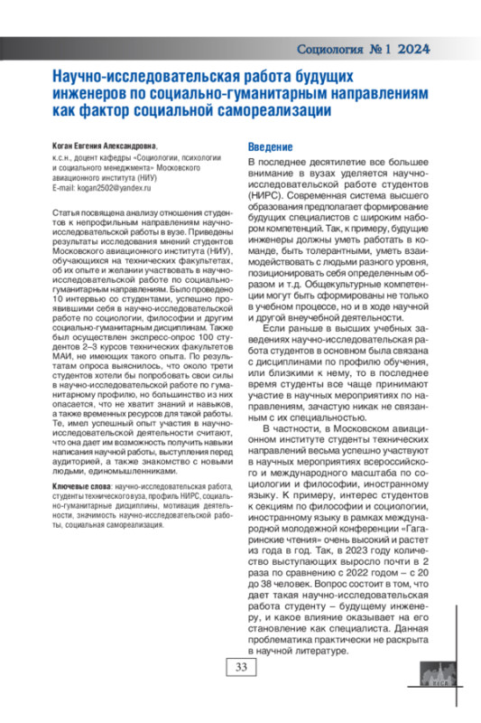 КОГАН Е. А. НАУЧНО-ИССЛЕДОВАТЕЛЬСКАЯ РАБОТА БУДУЩИХ ИНЖЕНЕРОВ ПО СОЦИАЛЬНО-ГУМАНИТАРНЫМ НАПРАВЛЕНИЯМ КАК ФАКТОР СОЦИАЛЬНОЙ САМОРЕАЛИЗАЦИИ // СОЦИОЛОГИЯ. 2024. № 1