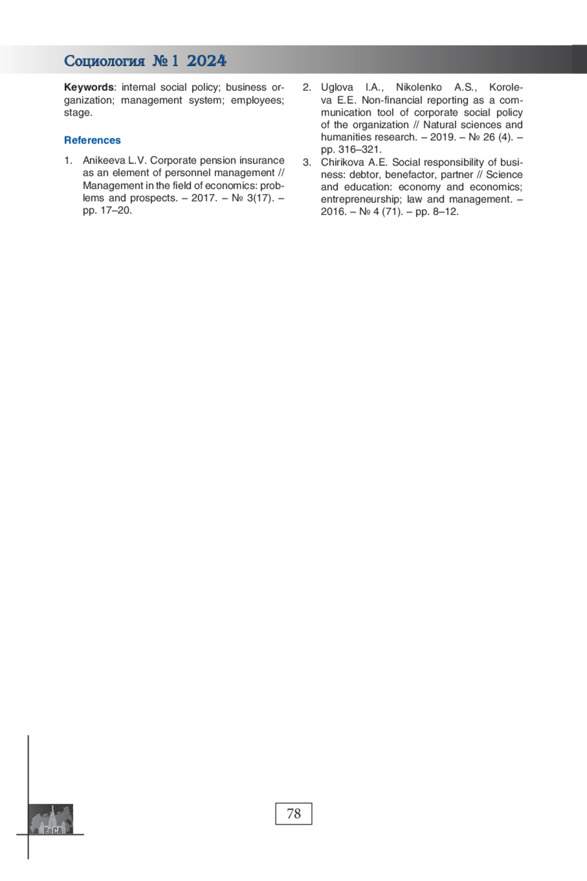 СЕМИКОЛЕННОВА Ю. А. СОВЕРШЕНСТВОВАНИЕ СИСТЕМЫ УПРАВЛЕНИЯ ВНУТРЕННЕЙ СОЦИАЛЬНОЙ ПОЛИТИКОЙ БИЗНЕС-ОРГАНИЗАЦИЙ: ВОЗМОЖНОСТИ СТРАТЕГИЧЕСКОГО ПОДХОДА // СОЦИОЛОГИЯ. 2024. № 1