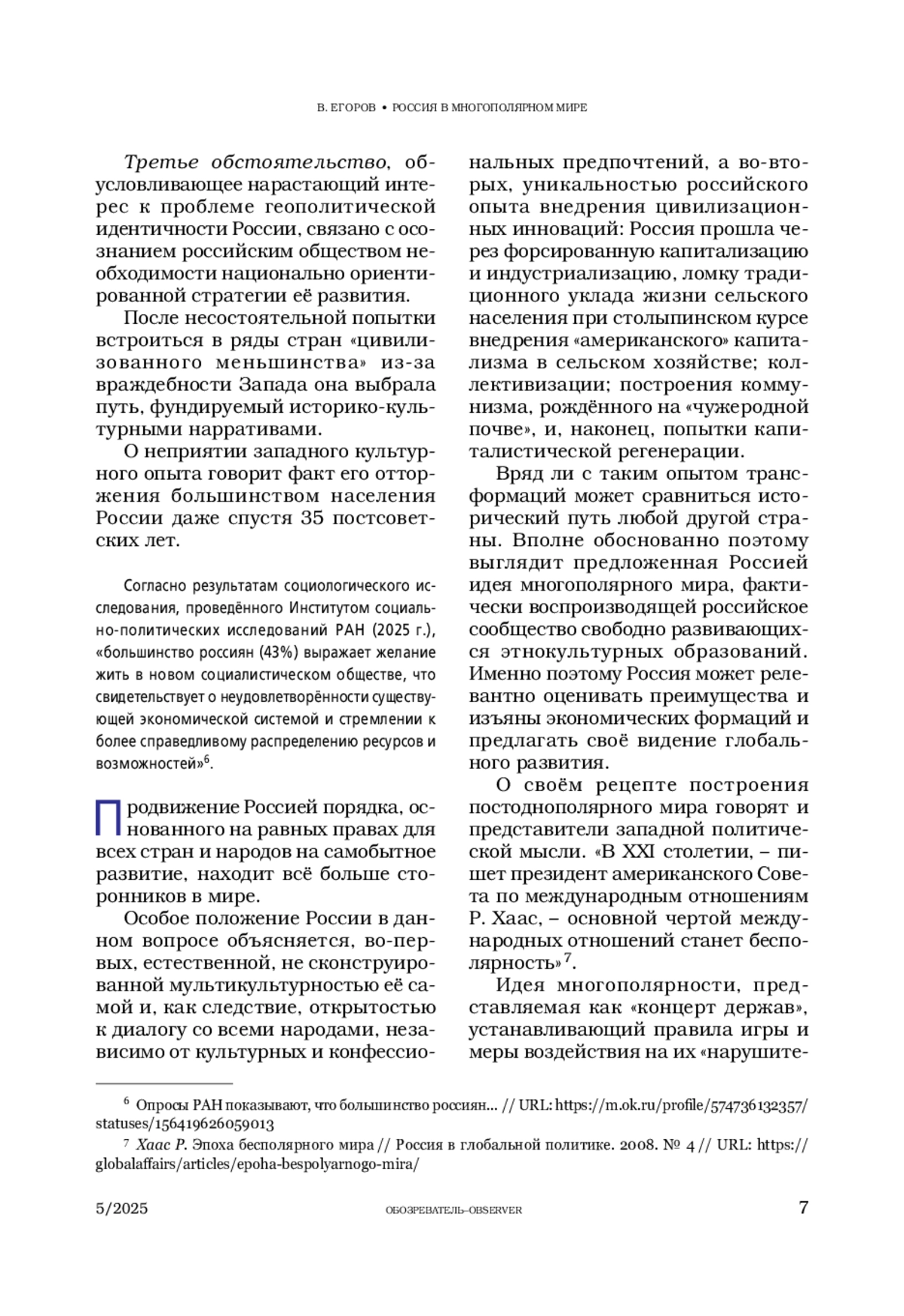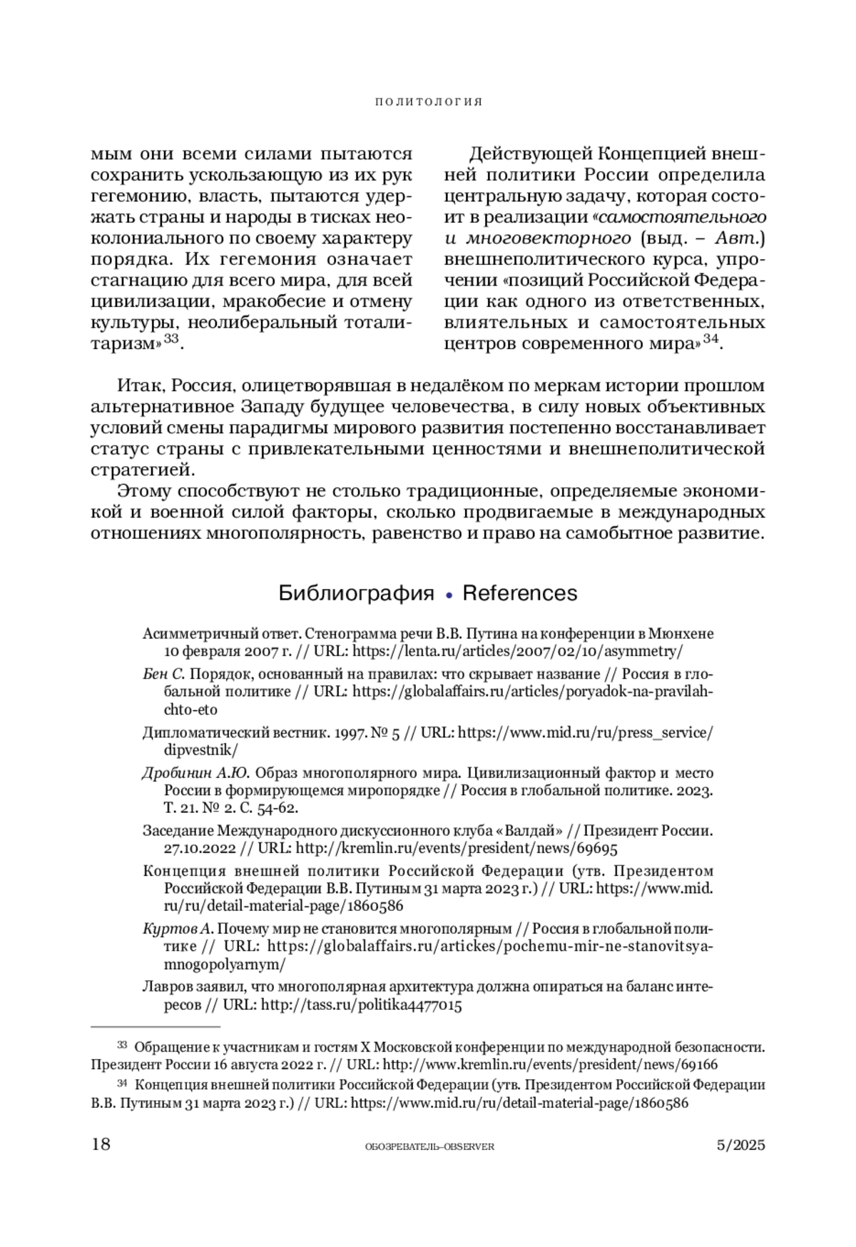 4. Дробинин А.Ю. Образ многополярного мира. Цивилизационный фактор и место России в формирующемся миропорядке // Россия в глобальной политике. 2023. Т. 21. № 2. С. 54-62.