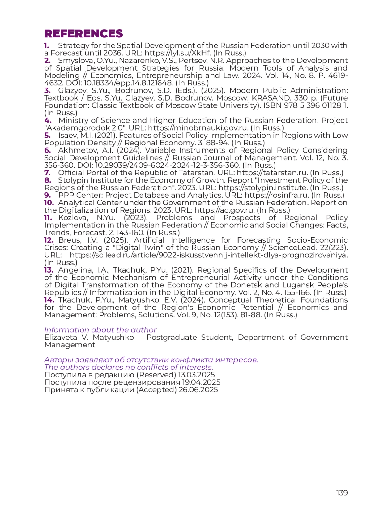 14. Ткачук П.Ю., Матюшко Е.В. Концептуальные теоретические основы развития экономического потенциала региона // Экономика и управление: проблемы, решения. 2024. Т. 9, № 12(153). С. 81-88.