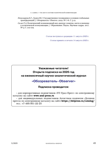 10. Пономарева Е.Г., Гужев М.С. Государственное телевидение в условиях глобальных трансформаций // Обозреватель-Observer. 2022. № 7-8. С. 5-21.