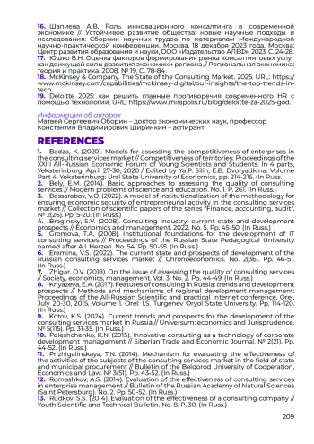 4. Брагинский С.В. Индустрия консалтинга: современное состояние и перспективы развития // Экономика и управление. 2022. № 5. С. 45-50.
