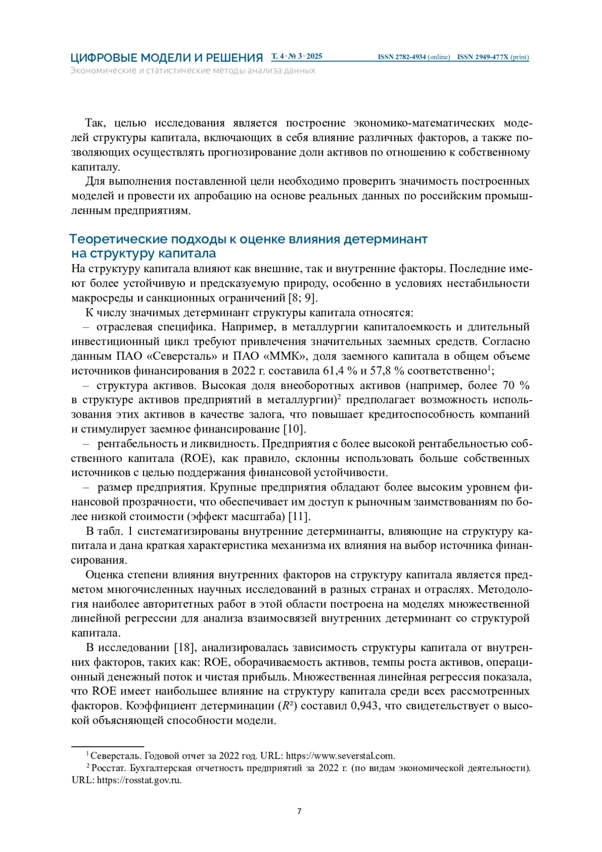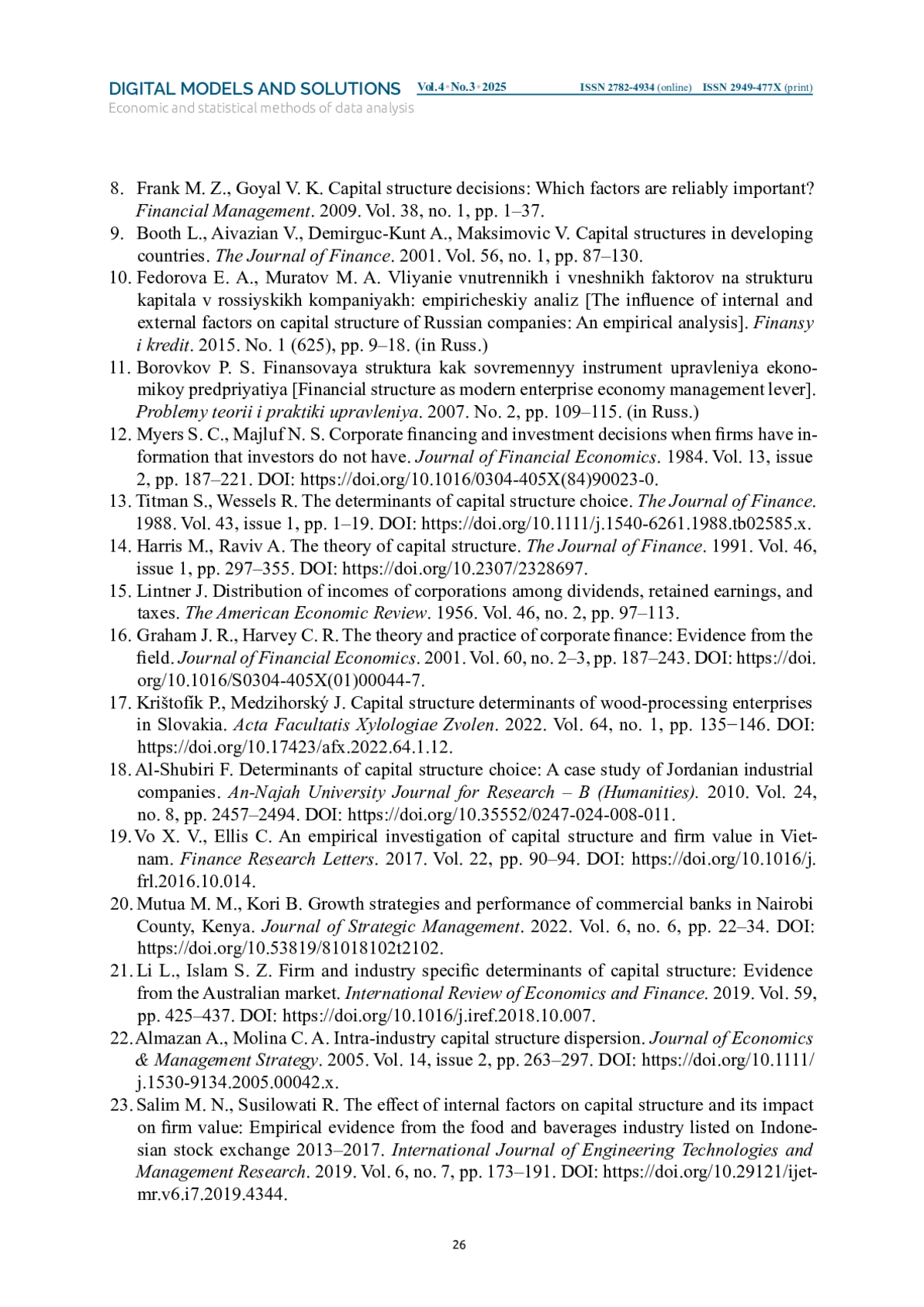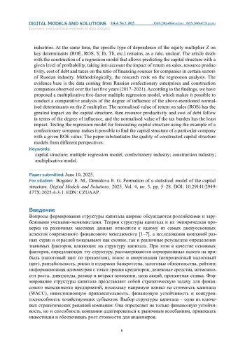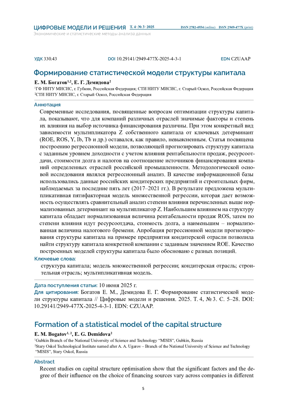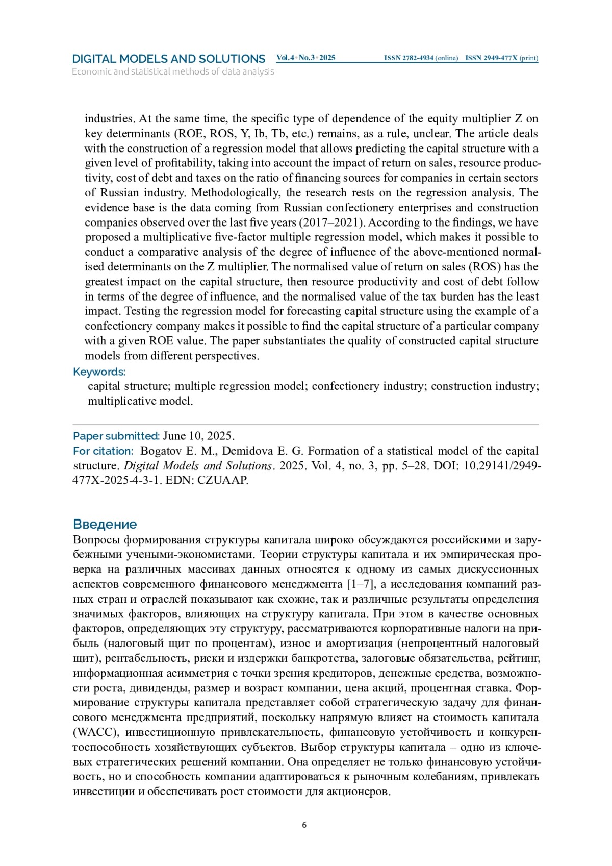 БОГАТОВ Е. М., ДЕМИДОВА Е. Г. ФОРМИРОВАНИЕ СТАТИСТИЧЕСКОЙ МОДЕЛИ СТРУКТУРЫ КАПИТАЛА // ЦИФРОВЫЕ МОДЕЛИ И РЕШЕНИЯ. 2025. Т. 4 № 3