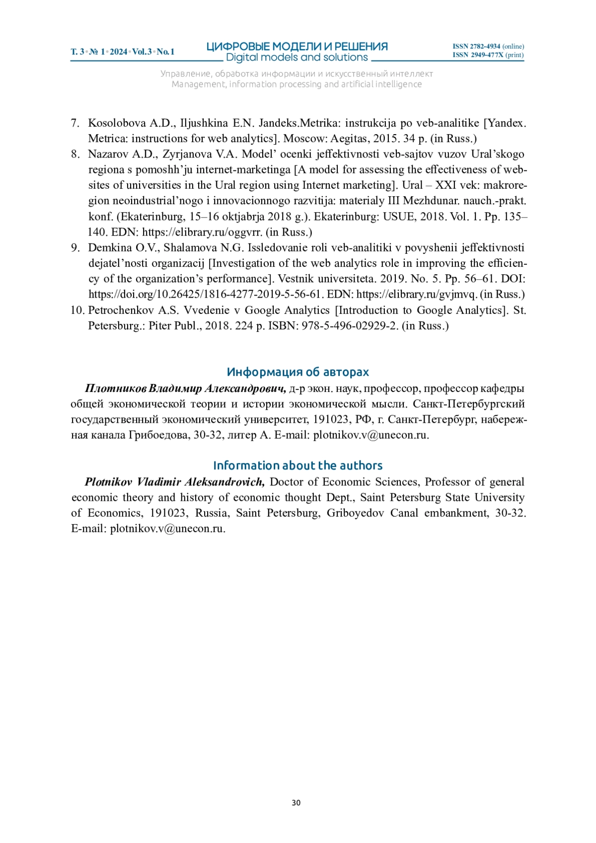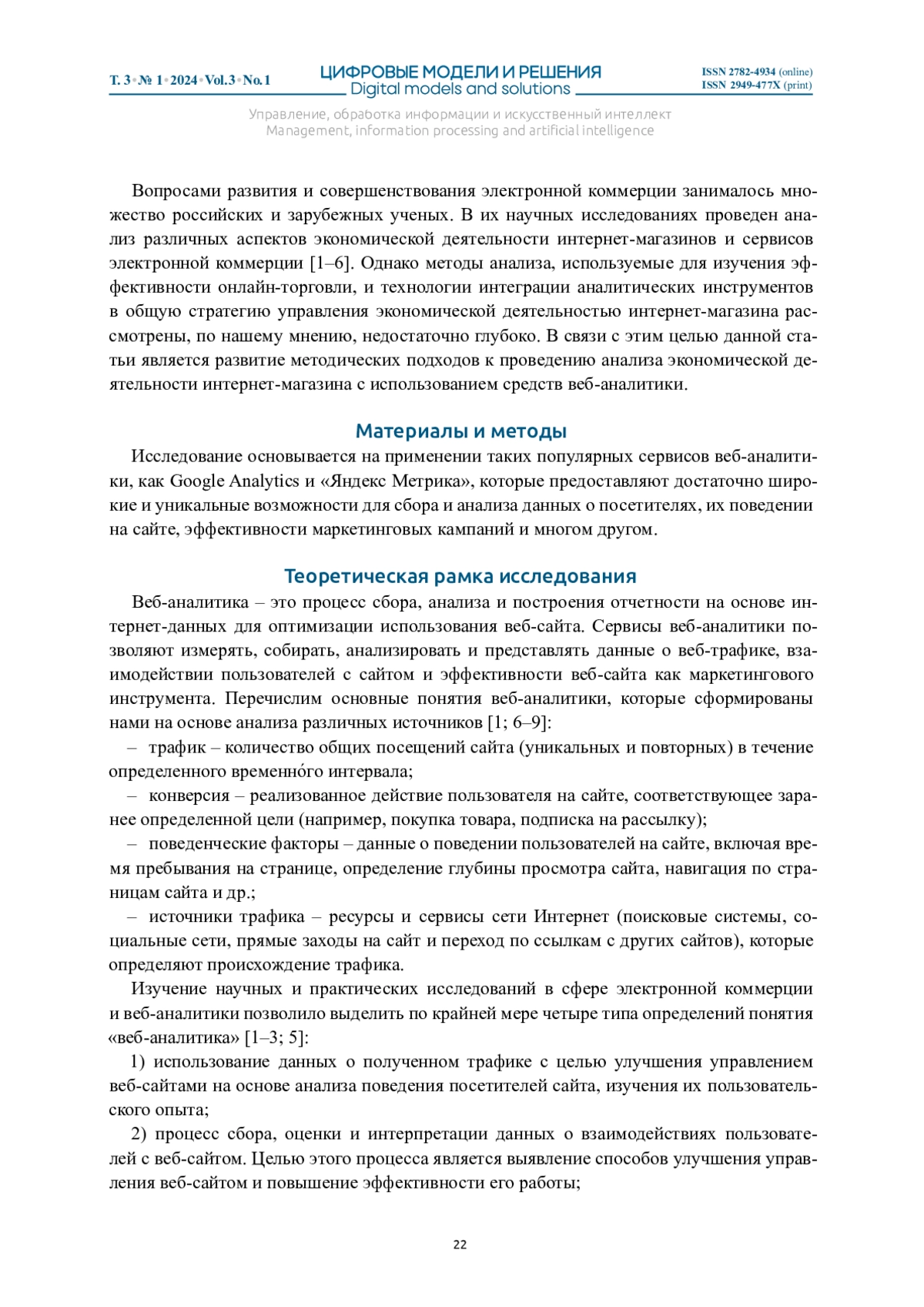 Современный рынок электронной коммерции представляет собой экономическую среду с высоким уровнем конкуренции, поэтому достижение коммерческого успеха на нем во многом зависит от способности торговых организаций анализировать и оптимизировать свою деятельность на основе данных, представляемых сервисами веб-аналитики. В статье освещается значимость веб-аналитики для оценки и улучшения работы интернет-магазина. Рассматриваются возможности, предоставляемые двумя ведущими инструментами в этой области: Google Analytics и «Яндекс Метрика». Основное внимание уделено анализу конверсии, пониманию целевой аудитории и оптимизации маркетинговых усилий. В статье предлагается комплексный подход к использованию веб-аналитики для повышения экономической эффективности и обеспечения устойчивого роста показателей экономической деятельности интернет-магазина