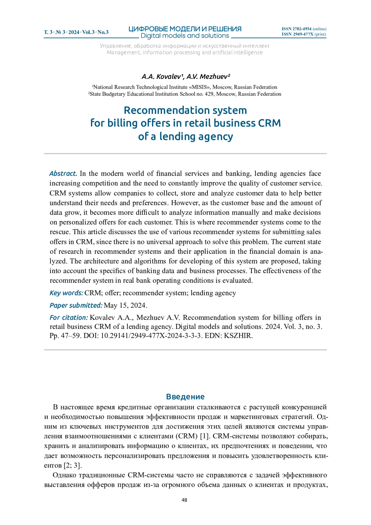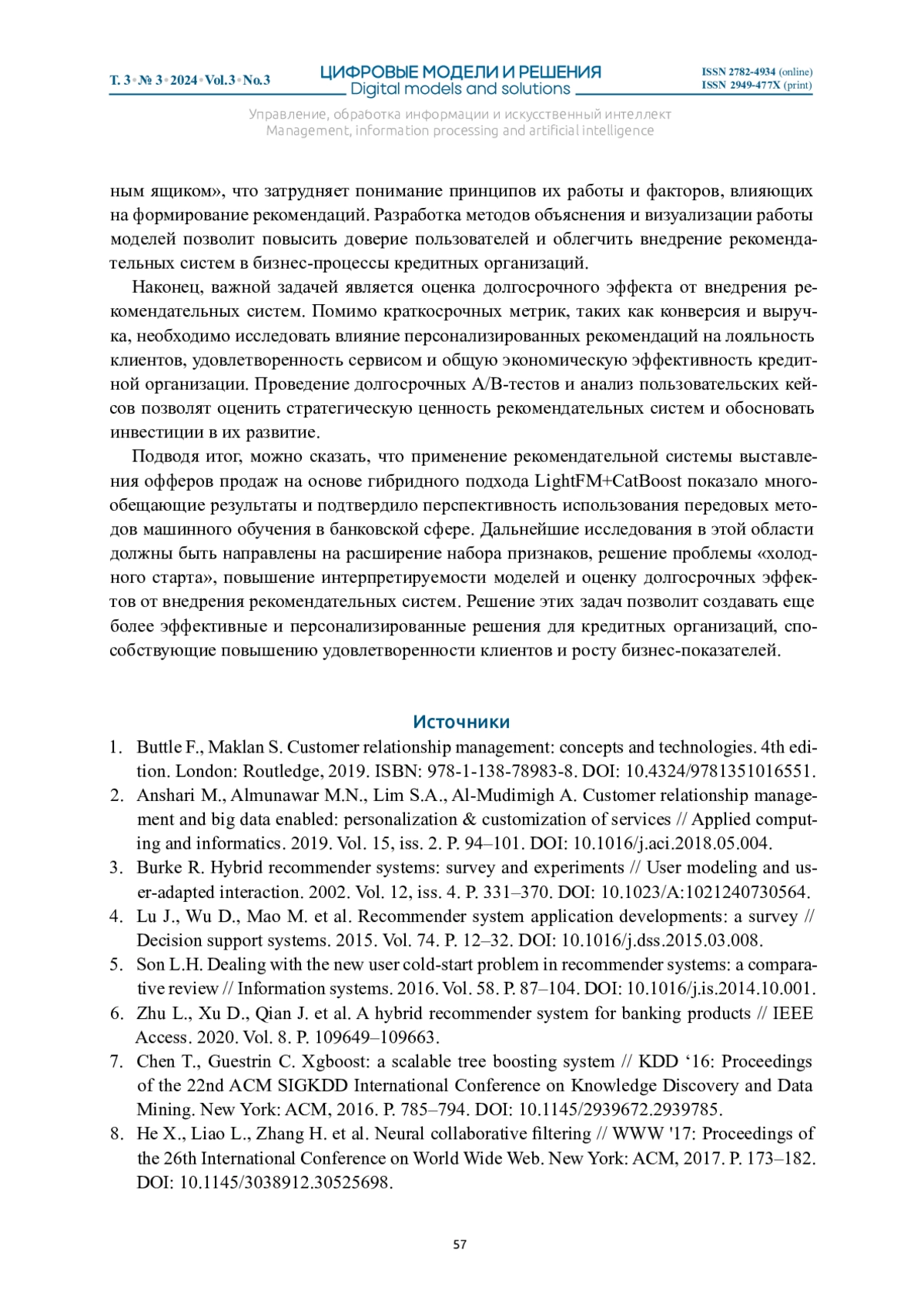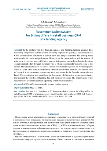 КОВАЛЕВ А. А., МЕЖУЕВ А. В. РЕКОМЕНДАТЕЛЬНАЯ СИСТЕМА ВЫСТАВЛЕНИЯ ОФФЕРОВ В CRM РОЗНИЧНОГО БИЗНЕСА КРЕДИТНОЙ ОРГАНИЗАЦИИ // ЦИФРОВЫЕ МОДЕЛИ И РЕШЕНИЯ. 2024. Т. 3 № 3