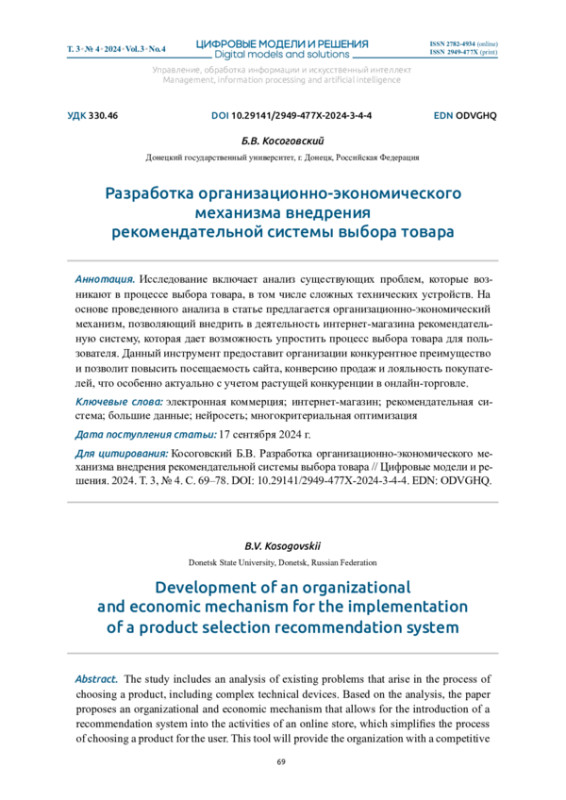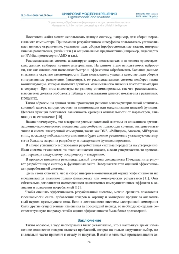 Исследование включает анализ существующих проблем, которые возникают в процессе выбора товара, в том числе сложных технических устройств. На основе проведенного анализа в статье предлагается организационно-экономический механизм, позволяющий внедрить в деятельность интернет-магазина рекомендательную систему, которая дает возможность упростить процесс выбора товара для пользователя. Данный инструмент предоставит организации конкурентное преимущество и позволит повысить посещаемость сайта, конверсию продаж и лояльность покупателей, что особенно актуально с учетом растущей конкуренции в онлайн-торговле