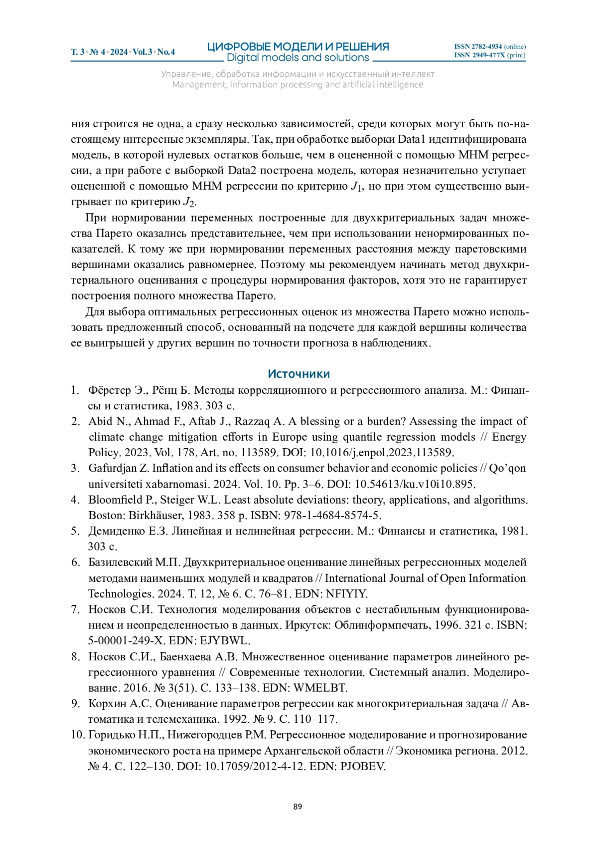 9. Корхин А.С. Оценивание параметров регрессии как многокритериальная задача // Автоматика и телемеханика. 1992. № 9. С. 110-117.