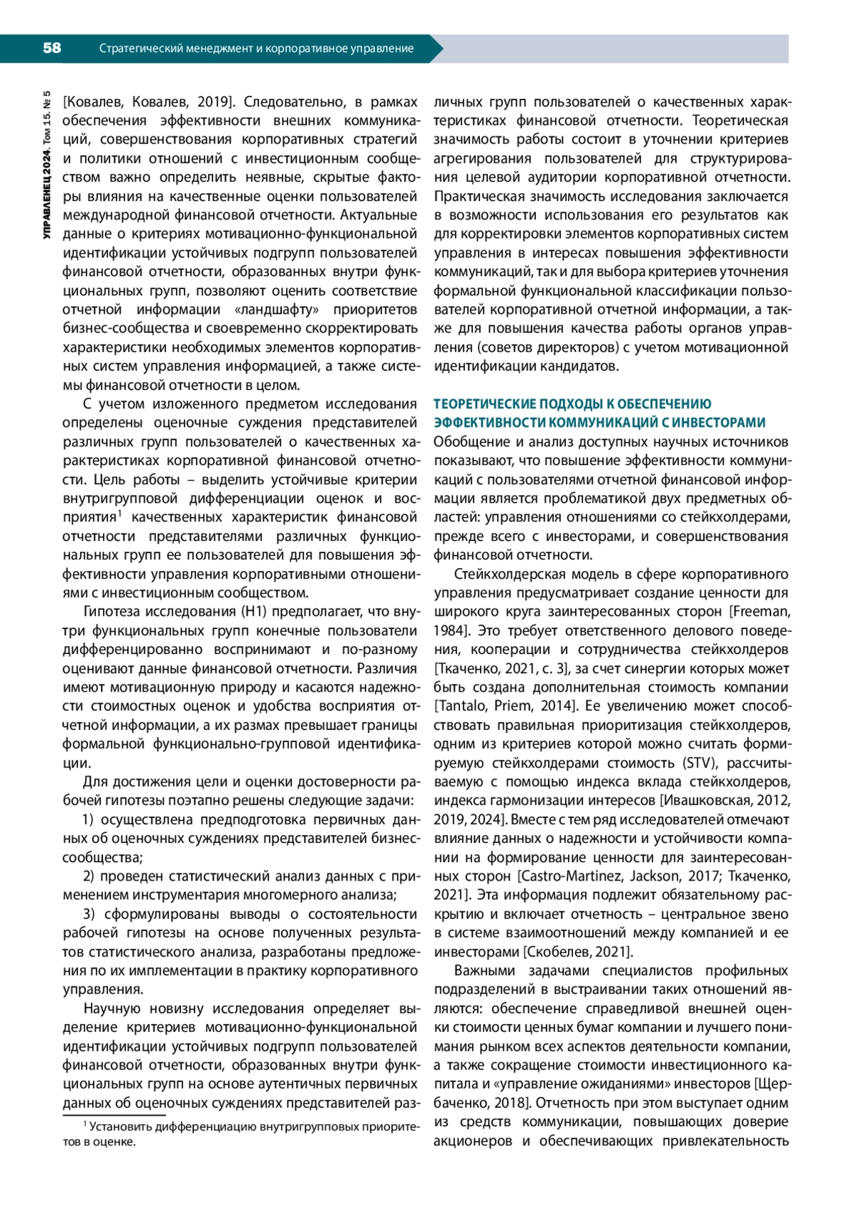 5. Ивашковская И.В. (2012). Стейкхолдерский подход к управлению, ориентированному на приращение стоимости компании // Корпоративные финансы. Т. 1, № 21. С. 14-23. EDN: OZZHEJ
