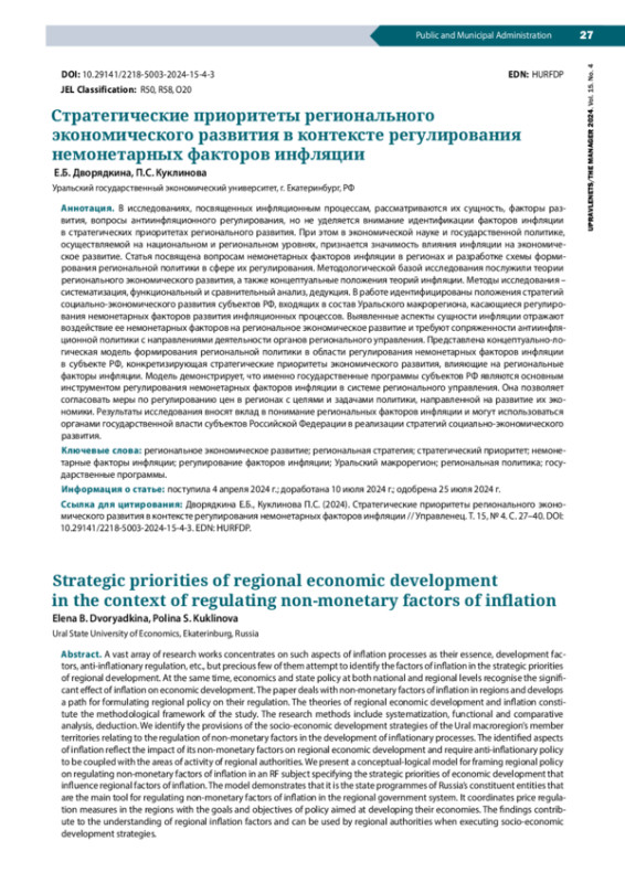 В исследованиях, посвященных инфляционным процессам, рассматриваются их сущность, факторы развития, вопросы антиинфляционного регулирования, но не уделяется внимание идентификации факторов инфляции в стратегических приоритетах регионального развития. При этом в экономической науке и государственной политике, осуществляемой на национальном и региональном уровнях, признается значимость влияния инфляции на экономическое развитие. Статья посвящена вопросам немонетарных факторов инфляции в регионах и разработке схемы формирования региональной политики в сфере их регулирования. Методологической базой исследования послужили теории регионального экономического развития, а также концептуальные положения теорий инфляции. Методы исследования – систематизация, функциональный и сравнительный анализ, дедукция. В работе идентифицированы положения стратегий социально-экономического развития субъектов РФ, входящих в состав Уральского макрорегиона, касающиеся регулирования немонетарных факторов развития инфляционных процессов. Выявленные аспекты сущности инфляции отражают воздействие ее немонетарных факторов на региональное экономическое развитие и требуют сопряженности антиинфляционной политики с направлениями деятельности органов регионального управления. Представлена концептуально-логическая модель формирования региональной политики в области регулирования немонетарных факторов инфляции в субъекте РФ, конкретизирующая стратегические приоритеты экономического развития, влияющие на региональные факторы инфляции. Модель демонстрирует, что именно государственные программы субъектов РФ являются основным инструментом регулирования немонетарных факторов инфляции в системе регионального управления. Она позволяет согласовать меры по регулированию цен в регионах с целями и задачами политики, направленной на развитие их экономики. Результаты исследования вносят вклад в понимание региональных факторов инфляции и могут использоваться органами государственной власти субъектов Российской Федерации в реализации стратегий социально-экономического развития.