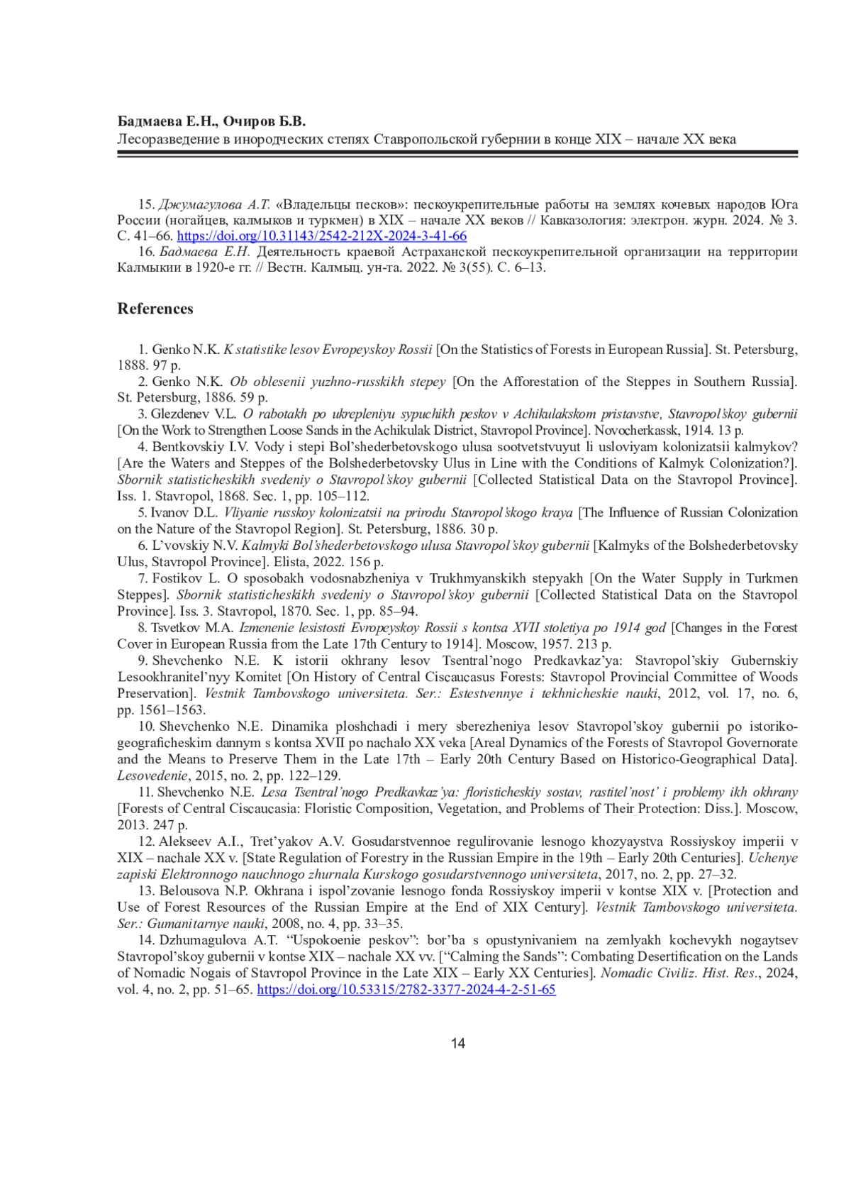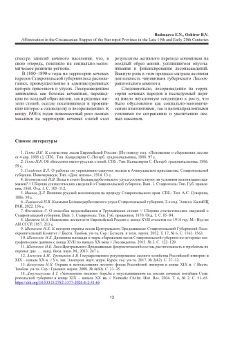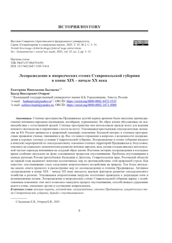 БАДМАЕВА Е. Н., ОЧИРОВ Б. В. ЛЕСОРАЗВЕДЕНИЕ В ИНОРОДЧЕСКИХ СТЕПЯХ СТАВРОПОЛЬСКОЙ ГУБЕРНИИ В КОНЦЕ XIX - НАЧАЛЕ XX ВЕКА // ВЕСТНИК СЕВЕРНОГО (АРКТИЧЕСКОГО) ФЕДЕРАЛЬНОГО УНИВЕРСИТЕТА. СЕРИЯ: ГУМАНИТАРНЫЕ И СОЦИАЛЬНЫЕ НАУКИ. 2025. Т. 25 № 2