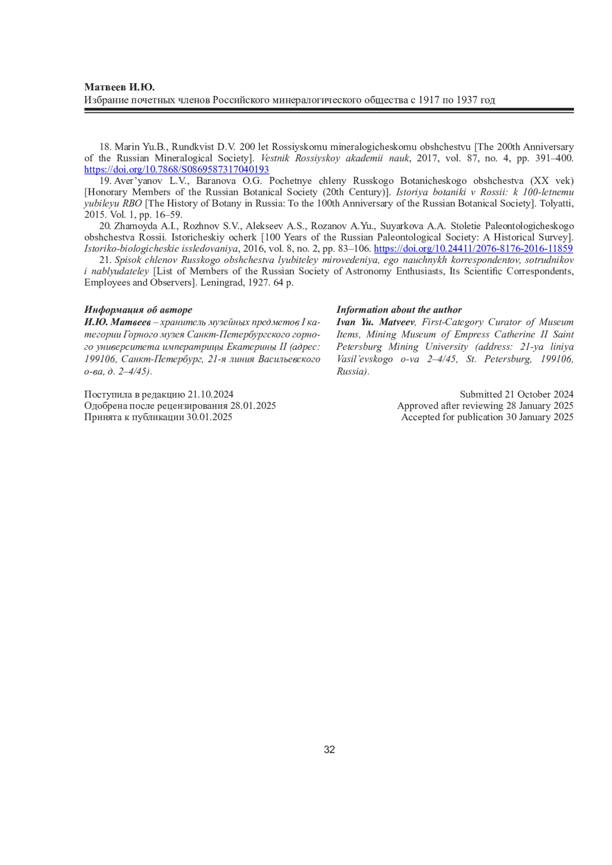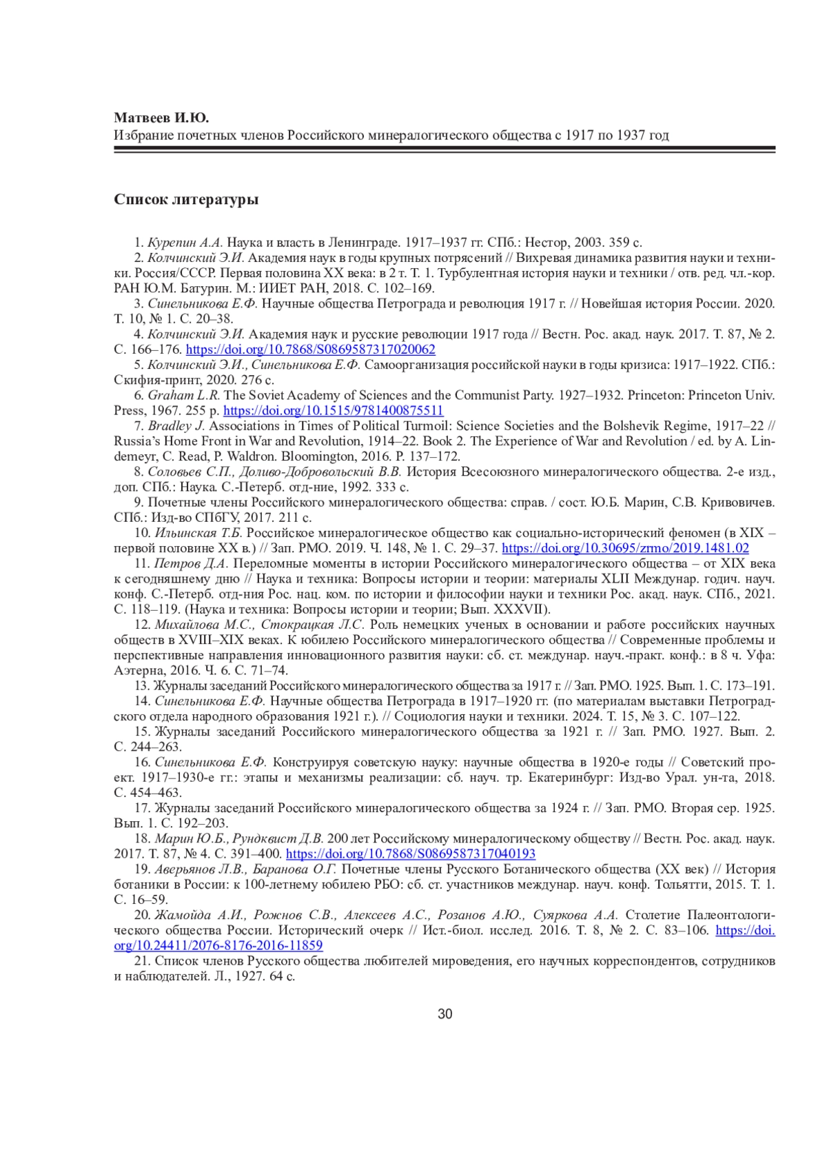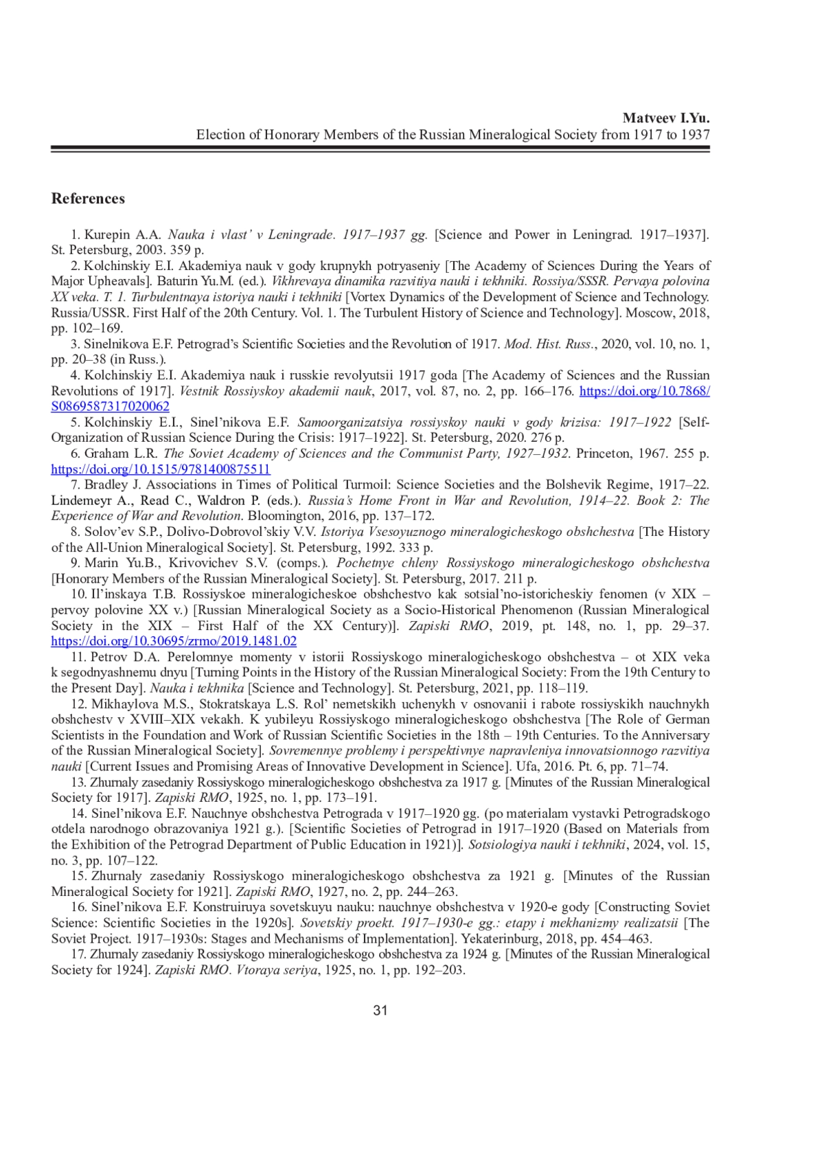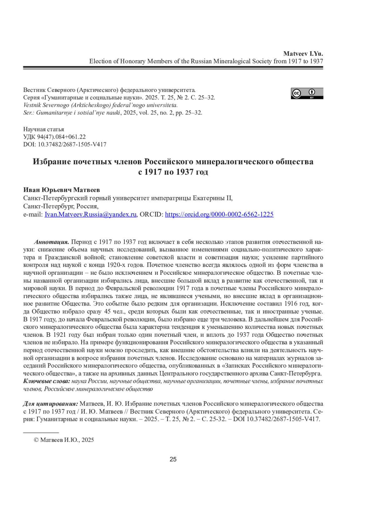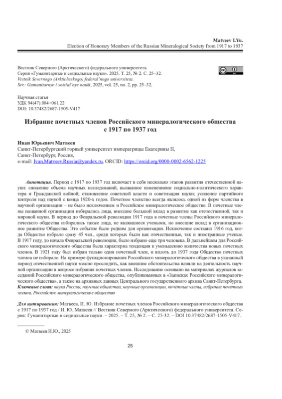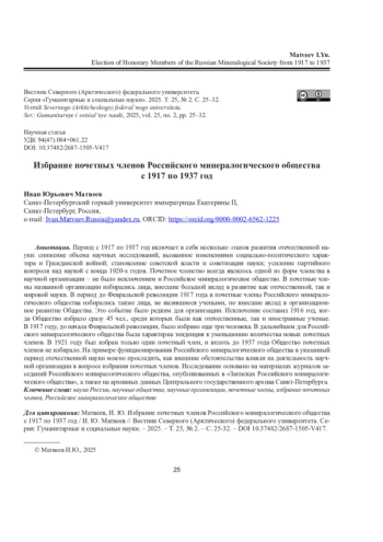 МАТВЕЕВ И. Ю. ИЗБРАНИЕ ПОЧЕТНЫХ ЧЛЕНОВ РОССИЙСКОГО МИНЕРАЛОГИЧЕСКОГО ОБЩЕСТВА С 1917 ПО 1937 ГОД // ВЕСТНИК СЕВЕРНОГО (АРКТИЧЕСКОГО) ФЕДЕРАЛЬНОГО УНИВЕРСИТЕТА. СЕРИЯ: ГУМАНИТАРНЫЕ И СОЦИАЛЬНЫЕ НАУКИ. 2025. Т. 25 № 2