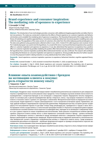 93. Yu X., Yuan C., Kim J., Wang S. (2020). A new form of brand experience in online social networks: An empirical analysis. Journal of Business Research, vol. 130, pp. 426-435. DOI: 10.1016/j.jbusres.2020.02.011 EDN: EKMBKQ