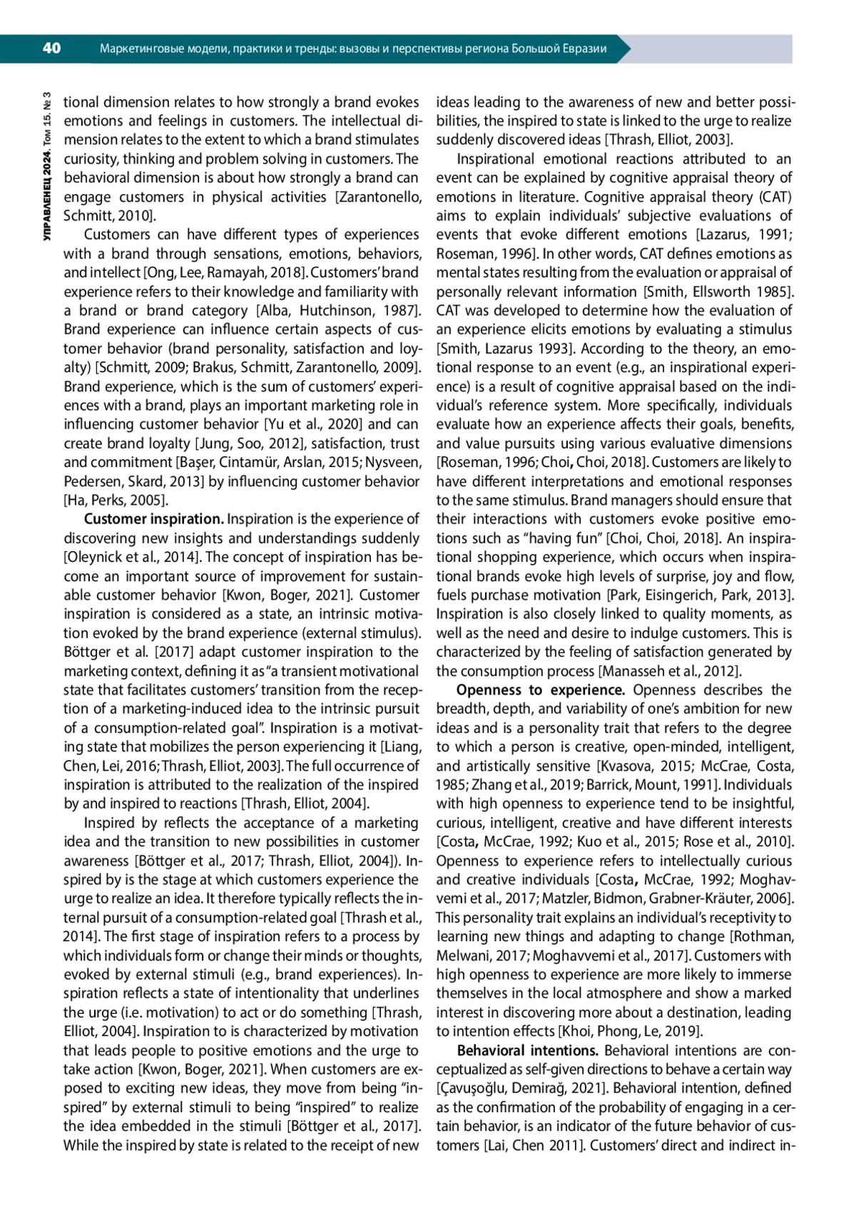 Customers actively seek unique and inspiring experiences in the consumption process [Becker, Jaakkola, 2020; Farrelly, 2019; Homburg, Jozic, Kuehnl, 2015; Hosany, 2011]. Thrash and Elliot [2003] define inspiration as a specific type of intrinsic motivation that is driven by external stimuli and leads to the realization of new ideas. Customer inspiration is recognized as a way to strengthen customer relationships [Ki, Park, Kim, 2022].
