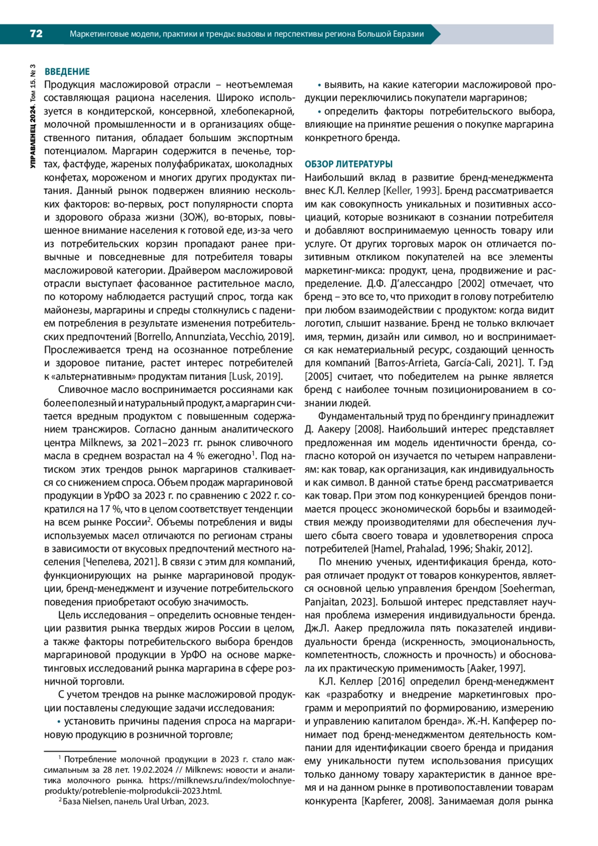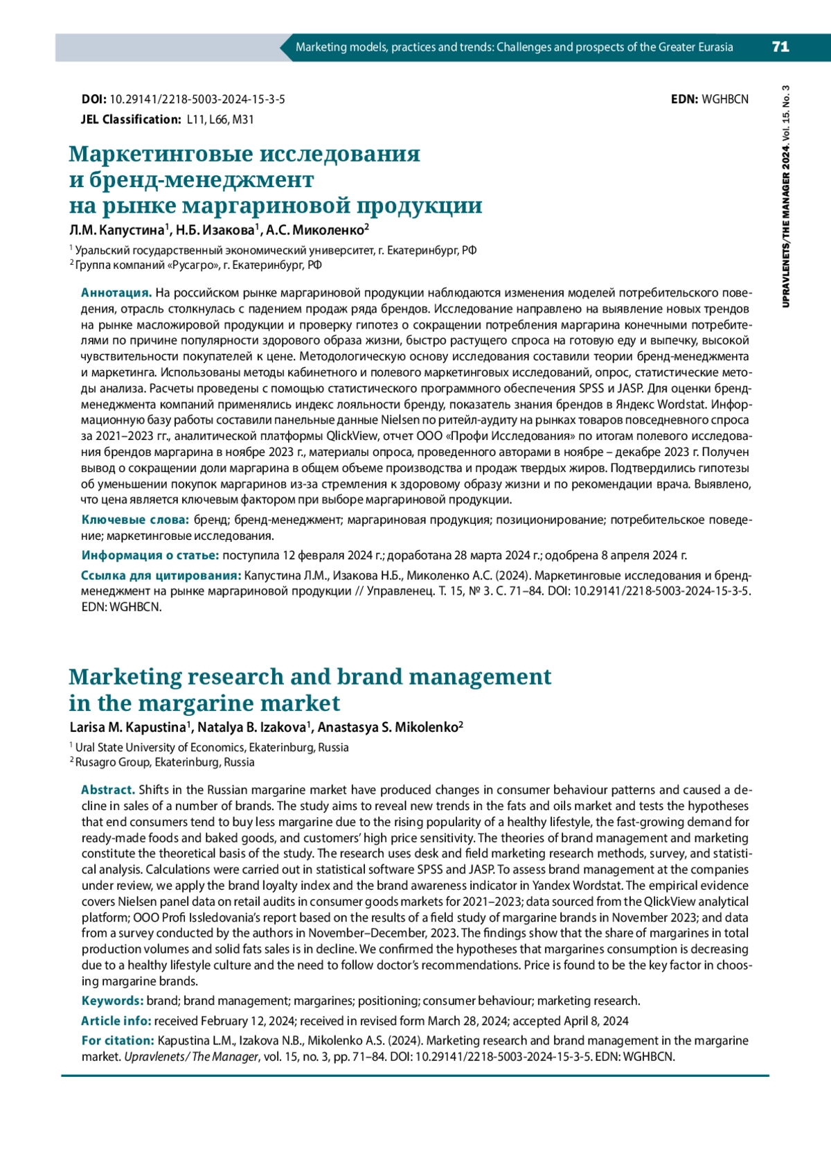 На российском рынке маргариновой продукции наблюдаются изменения моделей потребительского поведения, отрасль столкнулась с падением продаж ряда брендов. Исследование направлено на выявление новых трендов на рынке масложировой продукции и проверку гипотез о сокращении потребления маргарина конечными потребителями по причине популярности здорового образа жизни, быстро растущего спроса на готовую еду и выпечку, высокой чувствительности покупателей к цене. Методологическую основу исследования составили теории бренд-менеджмента и маркетинга. Использованы методы кабинетного и полевого маркетинговых исследований, опрос, статистические методы анализа. Расчеты проведены с помощью статистического программного обеспечения SPSS и JASP. Для оценки брендменеджмента компаний применялись индекс лояльности бренду, показатель знания брендов в Яндекс Wordstat. Информационную базу работы составили панельные данные Nielsen по ритейл-аудиту на рынках товаров повседневного спроса за 2021–2023 гг., аналитической платформы QlickView, отчет ООО «Профи Исследования» по итогам полевого исследования брендов маргарина в ноябре 2023 г., материалы опроса, проведенного авторами в ноябре – декабре 2023 г. Получен вывод о сокращении доли маргарина в общем объеме производства и продаж твердых жиров. Подтвердились гипотезы об уменьшении покупок маргаринов из-за стремления к здоровому образу жизни и по рекомендации врача. Выявлено, что цена является ключевым фактором при выборе маргариновой продукции.
