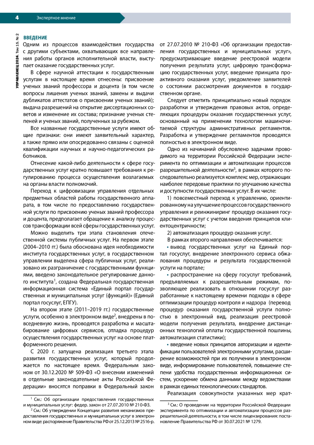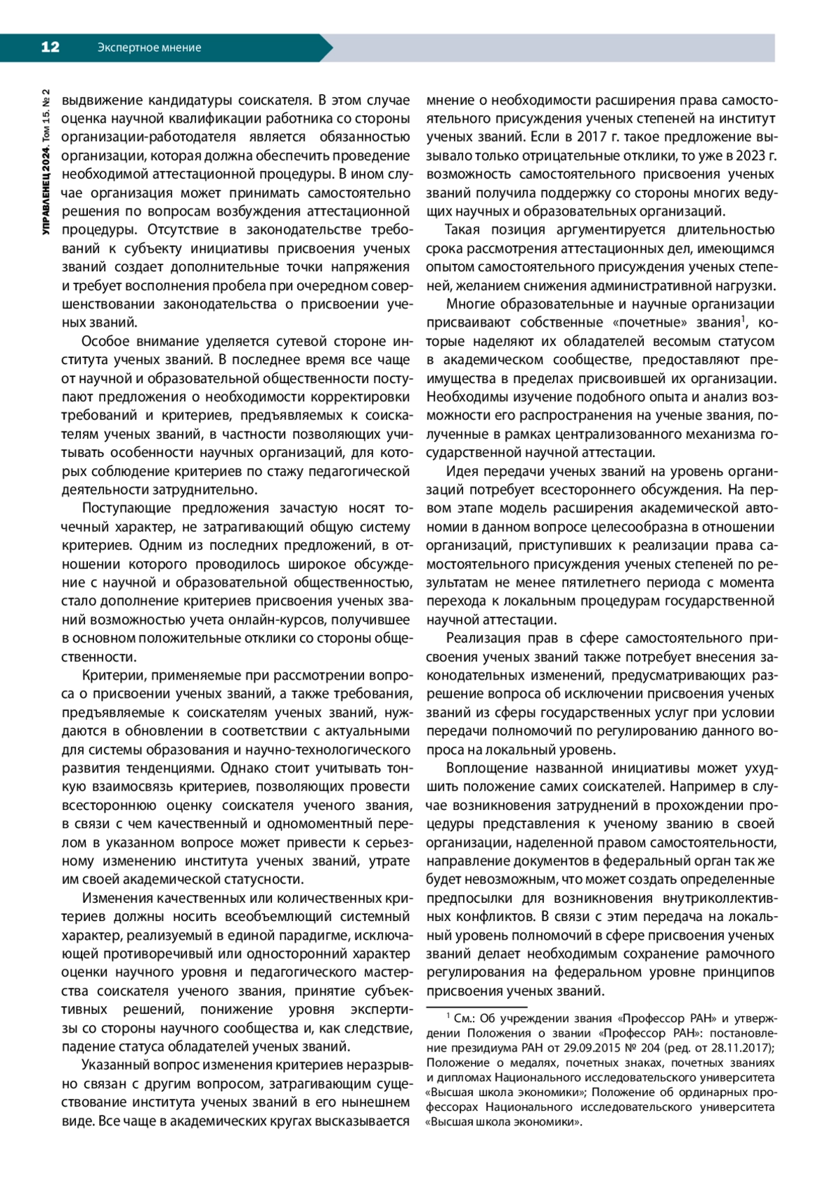 Переход к цифровой модели оказания государственной услуги присвоения ученых званий предполагает фундаментальные изменения этого общественного института. Они связаны не только с необходимостью разработки технологической карты цифровизации процесса предоставления услуги, но и с оптимизацией самой процедуры присвоения ученых званий. Статья раскрывает технологические и институциональные аспекты реализации цифровой реестровой модели оказания государственной услуги присвоения ученых званий. Методологической базой исследования служат теории государственного управления и публичных услуг, права, процессный подход и концепция цифровизации. В работе используются методы анализа бизнес-процессов. Информационная база исследования сформирована путем интеграции нормативных правовых актов, регламентирующих принципы и механизмы оказания государственных услуг по присвоению ученых званий, с рабочими проектными документами Департамента аттестации научных и научно-педагогических работников Министерства науки и высшего образования РФ. Отмечается необходимость легализации процедур инициирования представления соискателя к ученым званиям. Обосновывается отнесение ученых званий к академическим правам научных и научно-педагогических работников. Отдельное внимание уделяется преобразованию содержания института ученых званий, повышению его роли в оценке научной квалификации и в развитии академической карьеры. Рассматривается дискуссионный вопрос о предоставлении права самостоятельного присвоения ученых званий ведущим площадкам (переход к гибридному формату), подчеркивается значение баланса в определении степени локального и централизованного регулирования. В перспективе необходимым инструментом актуализации содержания ученых званий должна стать инициатива по модернизации комплекса количественных требований и критериев, предъявляемых к соискателям ученых званий.