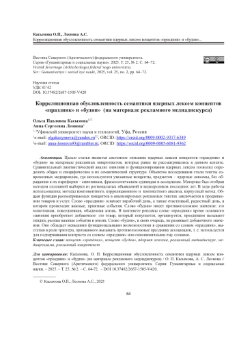 Целью статьи является системное описание ядерных лексем концептов «праздник» и «будни» на материале рекламных микротекстов, которые ранее не рассматривались в данном аспекте. Сравнительный лингвистический анализ значения и функционирования ядерных лексем позволил определить общее и специфическое в их семантической структуре. Объектом исследования стали тексты современных медиареклам, где используются указанные концепты, предметом - ядерные лексемы, без обращения к их периферии - синонимам, фразеологическим единицам и ассоциатам. Материал был отобран методом сплошной выборки из региональных объявлений и видеороликов последних лет. В ходе работы использовались методы компонентного, корреляционного и контекстного анализа, корпусный метод. Общая функция рассматриваемых концептов в анализируемых рекламных текстах заключается в продвижении товаров и услуг. Слово «праздник» означает нерабочий день, а также счастливый, радостный день, в котором происходят важные, приятные события. Слово «будни» имеет противоположное значение: это монотонная, повседневная, обыденная жизнь. В контексте рекламы слово «праздник» кроме основного значения приобретает добавочное: это товар, который покупается, организуется, праздником называют скидки, разные важные события в жизни. Слово «будни», в свою очередь, не развивает добавочного значения. Оно обладает меньшими функциональными возможностями в сравнении со словом «праздник», выступая в роли триггера, призванного вызывать противоположные празднику ассоциации, т. е. используется для подчеркивания контраста со словом «праздник» или синонимичными ему словами.