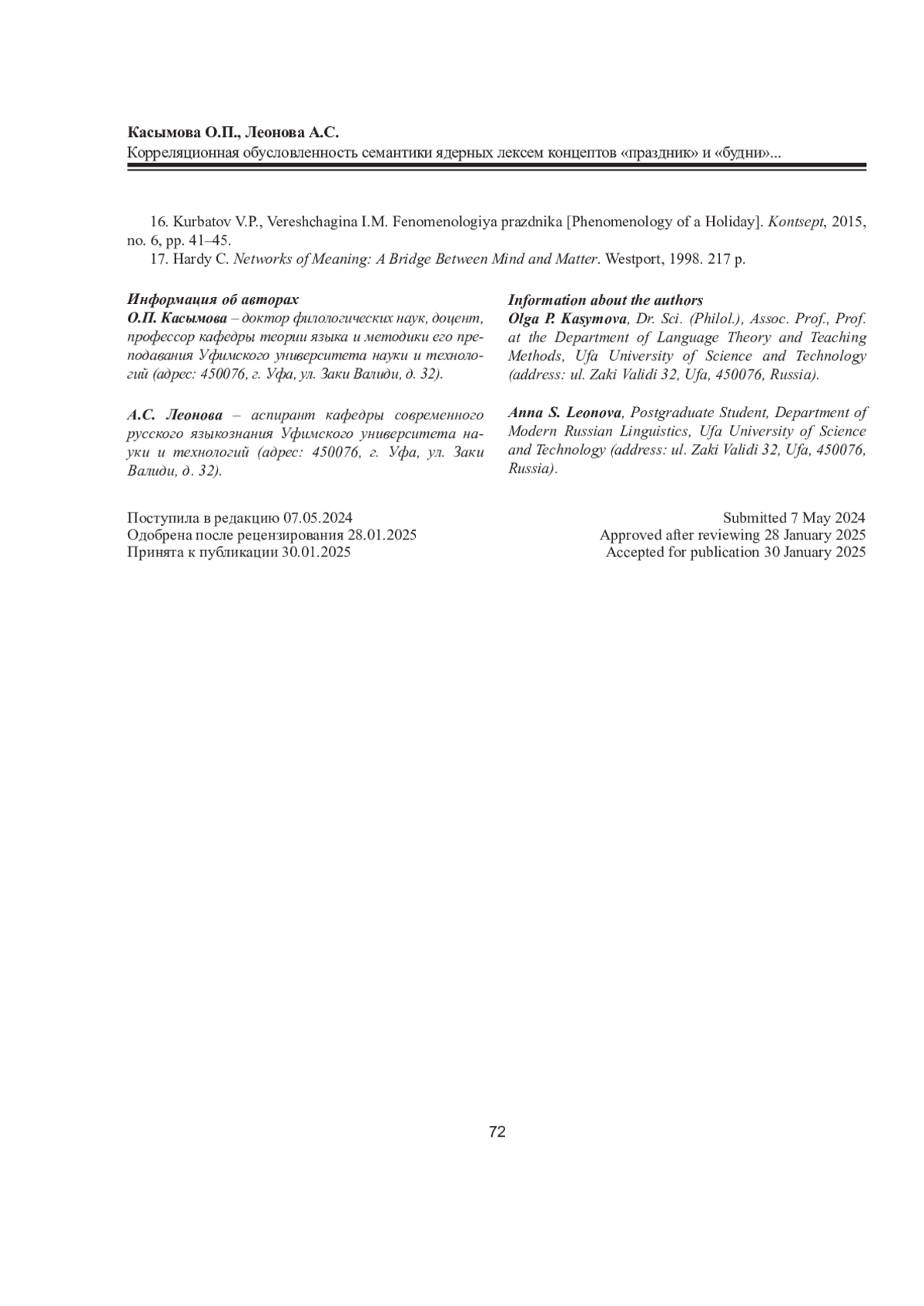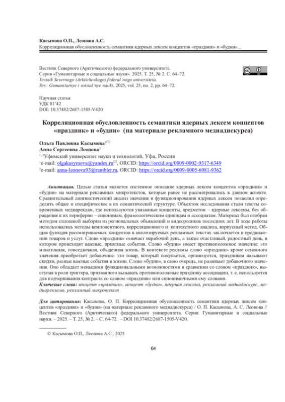 11. Касымова О.П., Леонова А.С. Симметрия и асимметрия семантической структуры многозначных слов “праздник” и “будни” // Рос. гуманит. журн. 2022. Т. 11, No 5. С. 382-389. EDN: DLCCFN