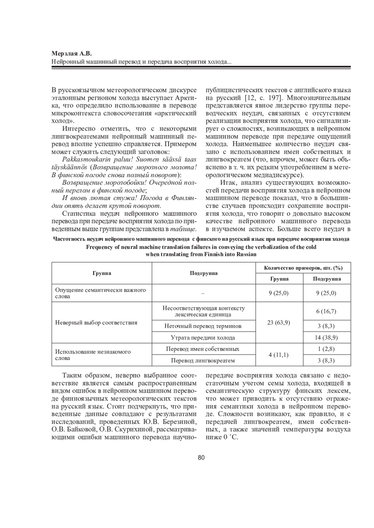 В данной статье представлено системное описание переводческих неудач, возникающих в результате нейронного машинного перевода на русский язык финноязычных метеорологических медиатекстов, содержащих прогнозы прохождения холодного фронта и фиксацию отрицательных температур. Актуальность темы обусловлена все более пристальным вниманием метеорологов к явлениям, связанным с изменением климата и погодными аномалиями, а также заинтересованностью специалистов IT-сферы в оптимизации систем нейронного машинного перевода, позволяющих существенно ускорить процесс межъязыковой коммуникации. Основная цель исследования состоит в выявлении и систематизации переводческих неудач, возникающих при переводе финноязычных метеотекстов о холодной погоде, которые опубликованы в электронной версии газеты «Iltalehti», и содержащихся в них признаках холода. Сначала методом сплошной выборки был проведен отбор микроконтекстов, затем посредством онлайн-переводчика DeepL Translate выполнен перевод отобранных метеотекстов, наконец, с помощью компонентного и контекстуального анализа выявлены и представлены основные типы переводческих неудач, рассмотрены причины их возникновения. Исследование показало, что наибольшее количество переводческих неудач при передаче средств вербализации холода связано с утратой ощущения холода, когда сема холода, включенная в семантическую структуру финской лексемы, не находит отражения в переводе на русский язык. Переводческие неудачи также могут быть связаны с выбором не соответствующей контексту лексической единицы, с использованием имен собственных и лингвокреатем, передача которых требует поиска оригинальных переводческих решений и чаще всего не может быть реализована при нейронном машинном переводе. Результаты исследования могут быть использованы в целях оптимизации систем нейронного машинного перевода. Возможно также применение полученных данных при обучении переводу и постредактированию переводов метеорологических медиатекстов.