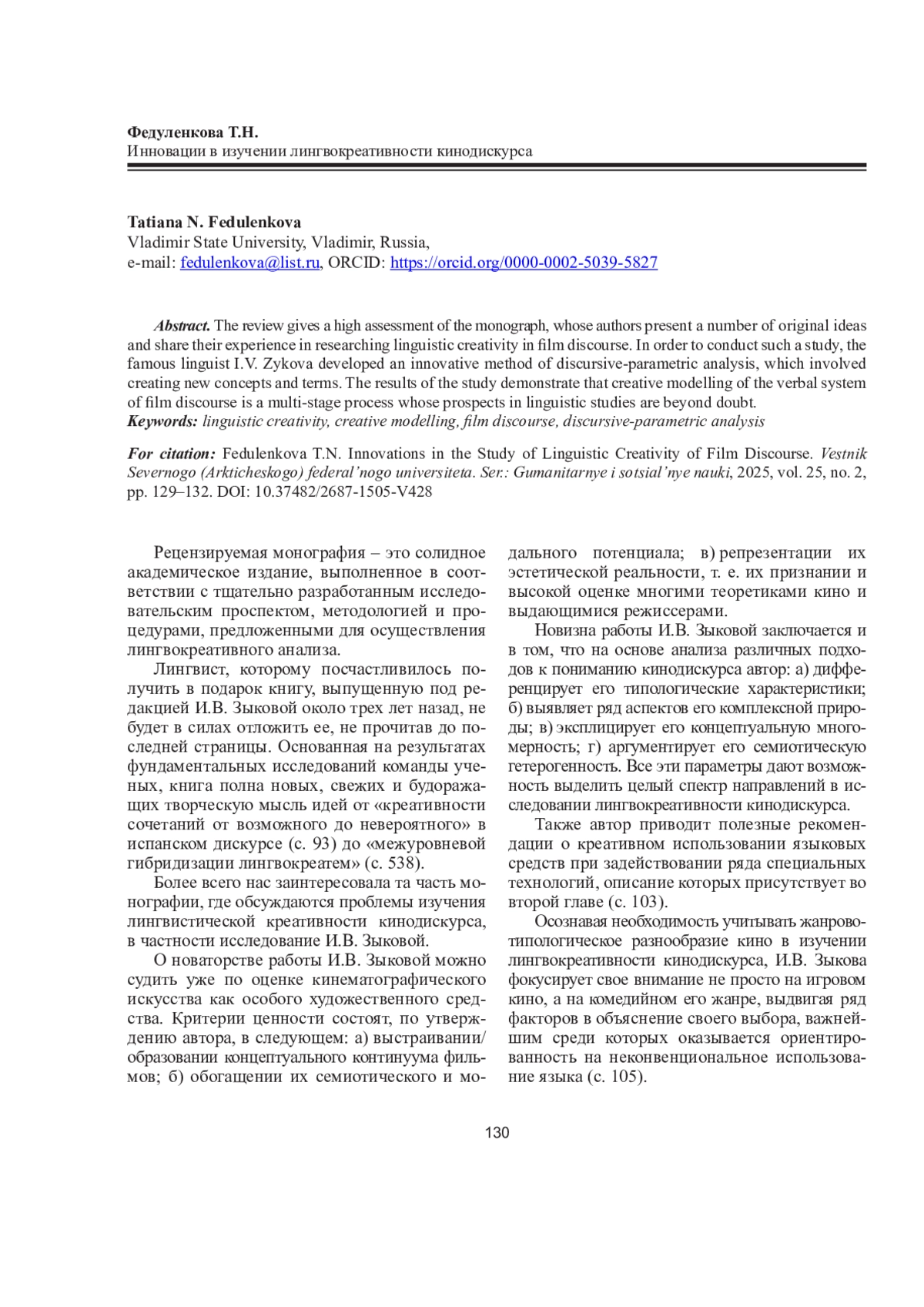 В рецензии дается высокая оценка полной новаторских идей монографии, авторы которой делятся опытом изучения лингвокреативности в кинодискурсе. С целью проведения такого исследования известный лингвист И. В. Зыкова разработала инновационный метод дискурсивно-параметрического анализа. Создание названного апробированного метода сопровождалось появлением специального понятийно-терминологического инструментария. Результаты проведенного исследования раскрывают многоступенчатость процесса креативного моделирования вербальной системы кинодискурса, перспективность применения которого в лингвистических штудиях не подлежит сомнению.