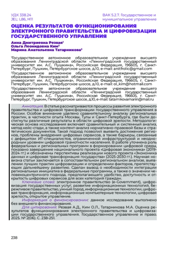 В статье рассматриваются процессы развития электронного правительства и цифровой трансформации государственного управления в России. Особое внимание уделено сравнительному анализу региональных практик, в частности опыта Москвы, Тулы и Санкт-Петербурга, где были достигнуты различные результаты в области цифровой зрелости. Методологическая основа исследования включает сравнительный и системный анализ, метод кейс-стади, а также контент-анализ нормативно-правовой базы и стратегических документов. Такой подход позволил выявить достижения регионов, проблемы внедрения цифровых сервисов, а также барьеры, связанные с дефицитом ИТ-специалистов, ограниченной инфраструктурой и неоднородным уровнем цифровой грамотности населения. В работе уточнена роль федеральных и региональных программ в формировании цифровой среды, показано завершение национального проекта «Цифровая экономика» (2019-2024 гг.) и обозначены перспективы реализации нового проекта «Экономика данных и цифровая трансформация государства» (2025-2030 гг.). Научная новизна статьи заключается в сопоставительном региональном анализе, выявлении лучших практик цифровизации и определении факторов, препятствующих дальнейшему развитию. Сделан вывод о необходимости интеграции региональных инициатив в федеральные программы, а также о значении человекоцентричного подхода, предполагающего удобство, доступность и открытость цифровых сервисов для всех категорий граждан.
