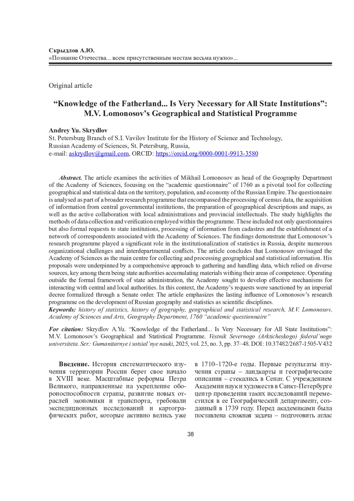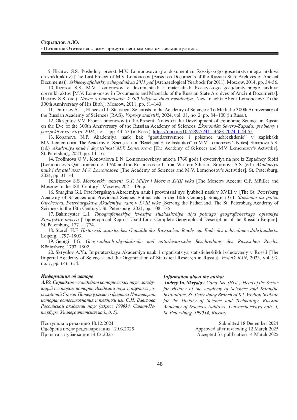 20. Скрыдлов А.Ю. Императорская Академия наук и организация статистических исследований в России // Вестн. РАН. 2023. Т. 93, № 7. С. 646-654.