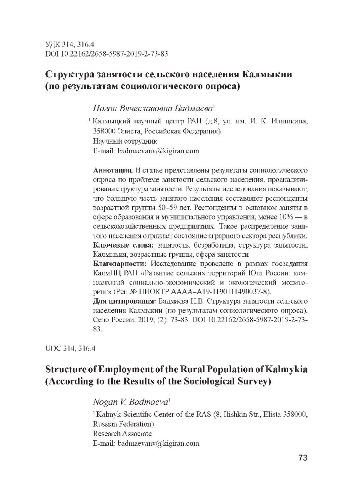В статье представлены результаты социологического опроса по проблеме занятости сельского населения, проанализирована структура занятости. Результаты исследования показывают, что большую часть занятого населения составляют респонденты возрастной группы 50-59 лет. Респонденты в основном заняты в сфере образования и муниципального управления, менее 10% — в сельскохозяйственных предприятиях. Такое распределение занятого населения отражает состояние аграрного сектора республики.
