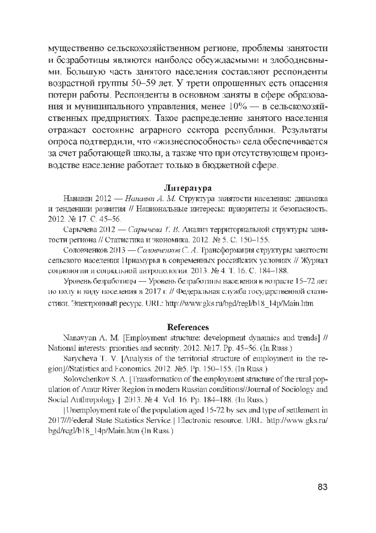 3. Соловченков С. А. Трансформация структуры занятости сельского населения Приамурья в современных российских условиях // Журнал социологии и социальной антропологии. 2013. № 4. Т. 16. С. 184-188.