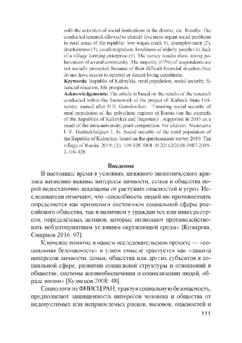 Введение. Под социальной безопасностью понимается защищенность интересов каждой личности и социума от различных вызовов, рисков, угроз, обеспечение важнейших прав человека (на жизнь, на труд и его достойную оплату, на бесплатное лечение и обучение, на доступный отдых, на гарантированную социальную защиту и др.), поддержание условий жизни и деятельности, удовлетворяющих человека. Цель статьи — используя отдельные результаты анкетного опроса сельского населения Республики Калмыкия, проведенного в мае 2019 г. (N=253), рассмотреть: оценку селянами собственного материального положения, факторов, влияющих на его ухудшение или улучшение, мнение об экономической ситуации в республике, степень удовлетворенности сельчан от деятельности социальных учреждений в районе и т. д. Результаты. Проведенное исследование позволило определить пятерку наиболее актуальных социальных проблем сельских территорий республики: низкий уровень оплаты труда (ранг 1), безработица (2), пьянство (3), миграция молодежи, одиночество стариков (4), отсутствие селообразующего предприятия (5). Результаты опроса показывают сильную поляризацию сельского сообщества. Большинство (67 %) респондентов социально не защищены, в силу сложного материального положения им недоступны оптимальные или достойные условия жизни.