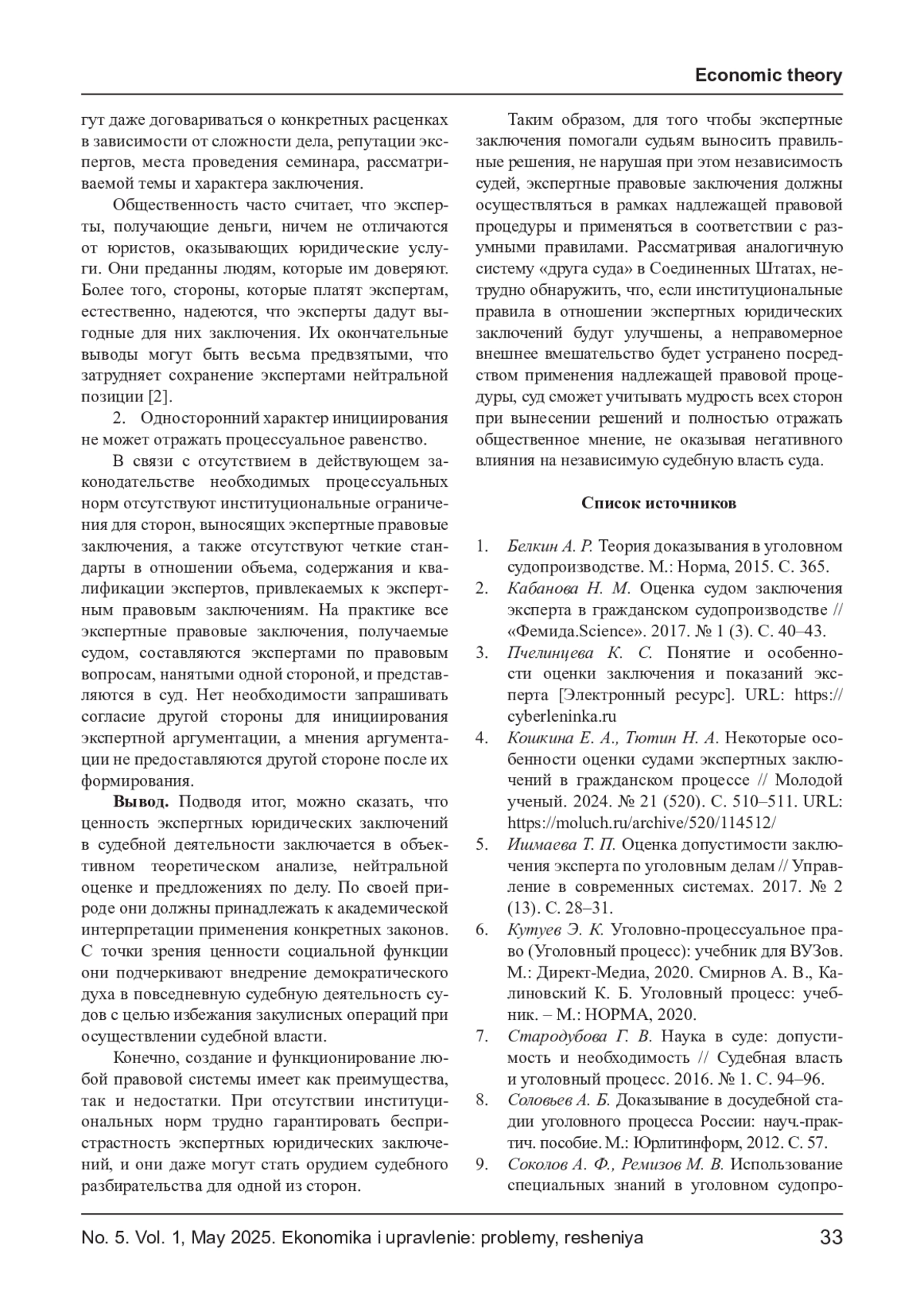 ХАДИСОВ В. Х., БАЙСУЛТАНОВ А. Б. ОЦЕНКА ЮРИДИЧЕСКОЙ ЦЕННОСТИ ЭКСПЕРТНЫХ ЗАКЛЮЧЕНИЙ И ИХ ПРИМЕНЕНИЕ В СУДЕБНОЙ ДЕЯТЕЛЬНОСТИ СОВРЕМЕННОЙ ЭКОНОМИЧЕСКОЙ СИСТЕМЫ // ЭКОНОМИКА И УПРАВЛЕНИЕ: ПРОБЛЕМЫ, РЕШЕНИЯ. 2025. ТОМ 1 № 5