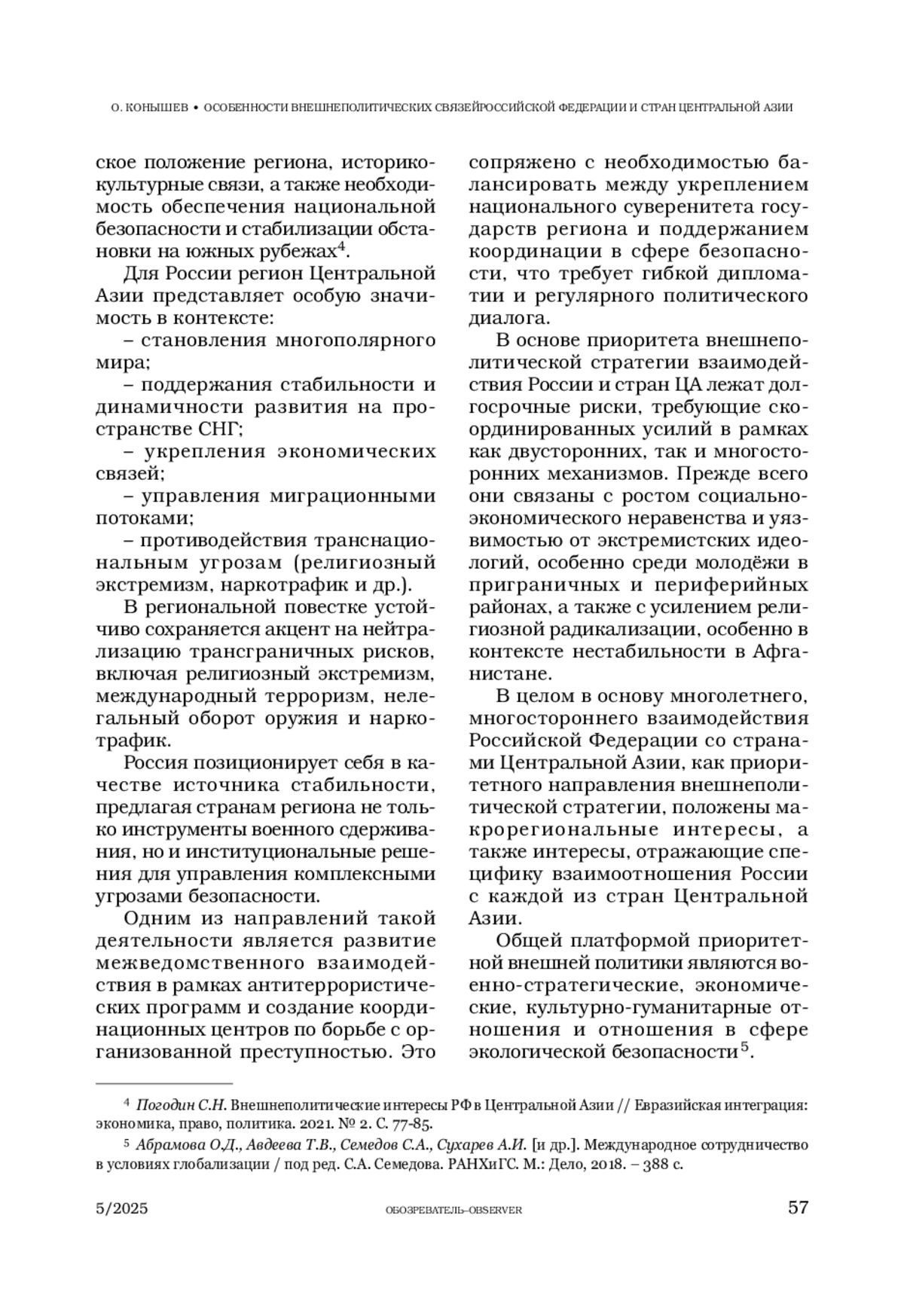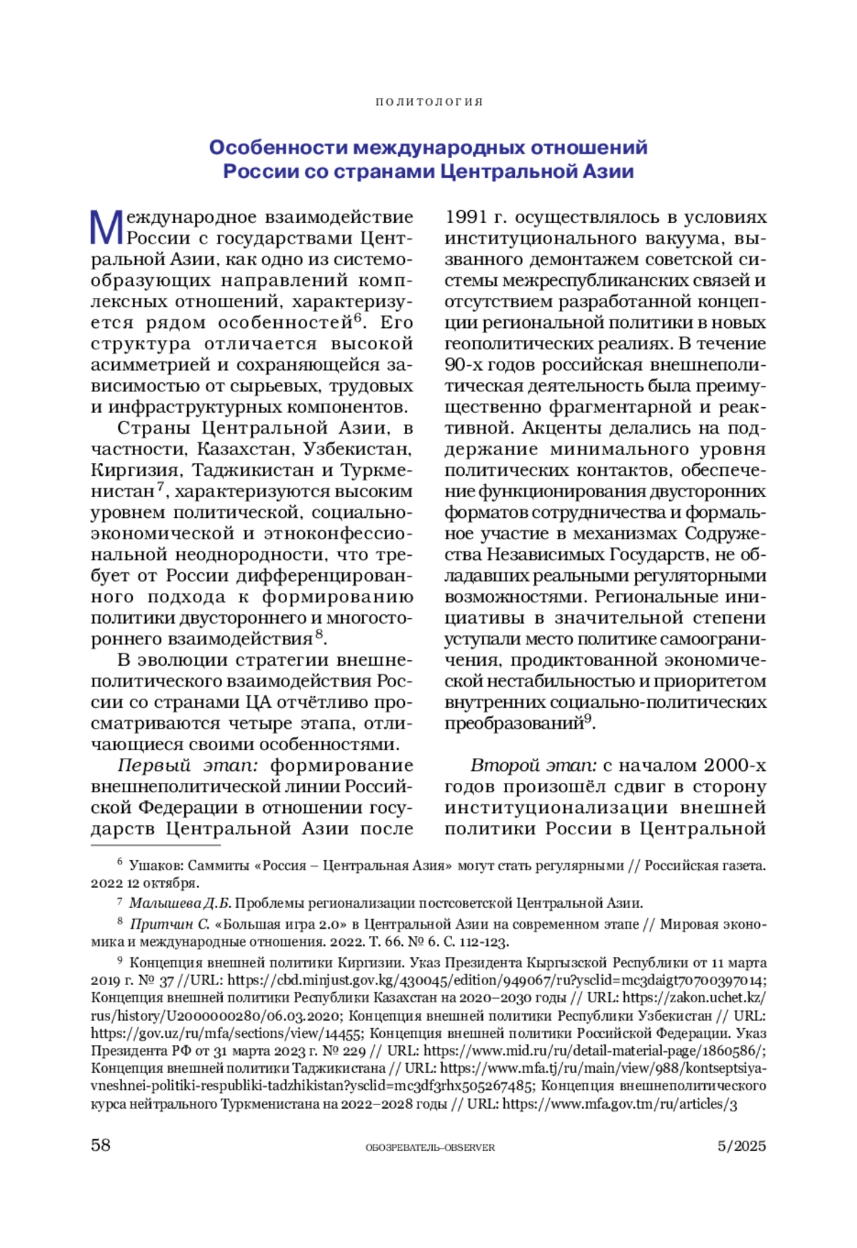 Страны Центральной Азии, в частности, Казахстан, Узбекистан, Киргизия, Таджикистан и Туркменистан, характеризуются высоким уровнем политической, социально-экономической и этноконфессиональной неоднородности, что требует от России дифференцированного подхода к формированию политики двустороннего и многостороннего взаимодействия.