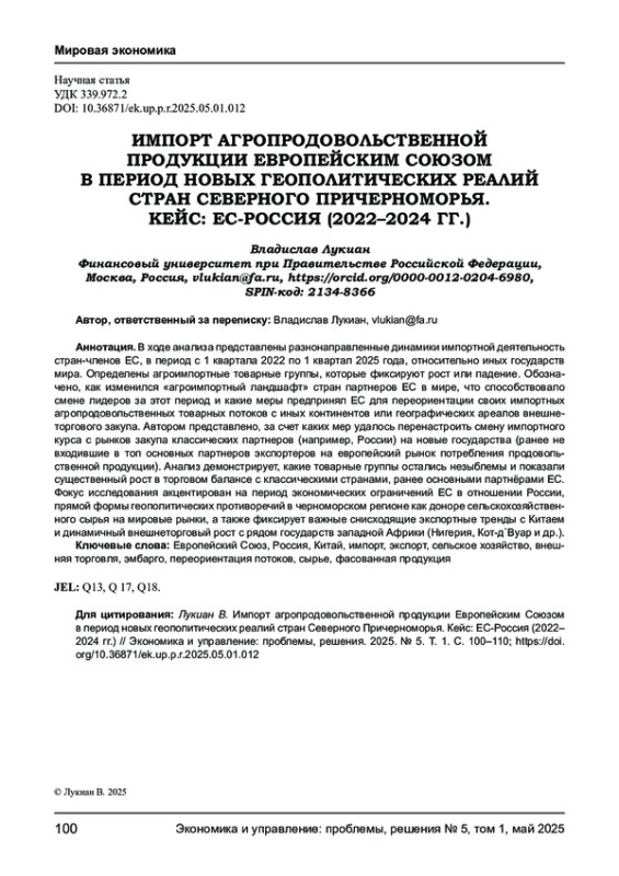 В ходе анализа представлены разнонаправленные динамики импортной деятельность стран-членов ЕС, в период с 1 квартала 2022 по 1 квартал 2025 года, относительно иных государств мира. Определены агроимпортные товарные группы, которые фиксируют рост или падение. Обозначено, как изменился «агроимпортный ландшафт» стран партнеров ЕС в мире, что способствовало смене лидеров за этот период и какие меры предпринял ЕС для переориентации своих импортных агропродовольственных товарных потоков с иных континентов или географических ареалов внешнеторгового закупа. Автором представлено, за счет каких мер удалось перенастроить смену импортного курса с рынков закупа классических партнеров (например, России) на новые государства (ранее не входившие в топ основных партнеров экспортеров на европейский рынок потребления продовольственной продукции). Анализ демонстрирует, какие товарные группы остались незыблемы и показали существенный рост в торговом балансе с классическими странами, ранее основными партнёрами ЕС. Фокус исследования акцентирован на период экономических ограничений ЕС в отношении России, прямой формы геополитических противоречий в черноморском регионе как доноре сельскохозяйственного сырья на мировые рынки, а также фиксирует важные снисходящие экспортные тренды с Китаем и динамичный внешнеторговый рост с рядом государств западной Африки (Нигерия, Кот-д`Вуар и др.).