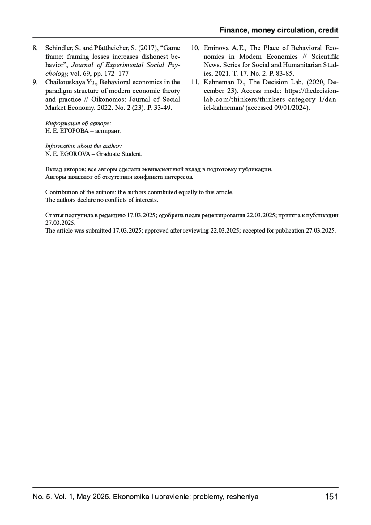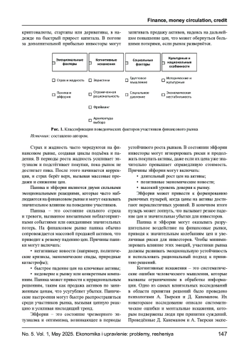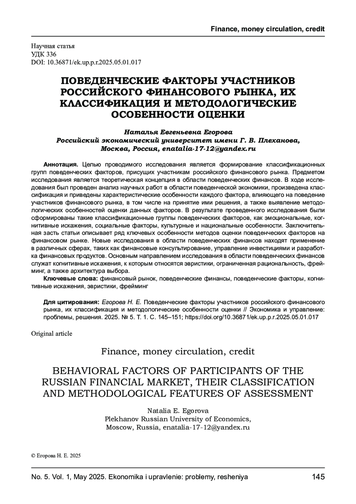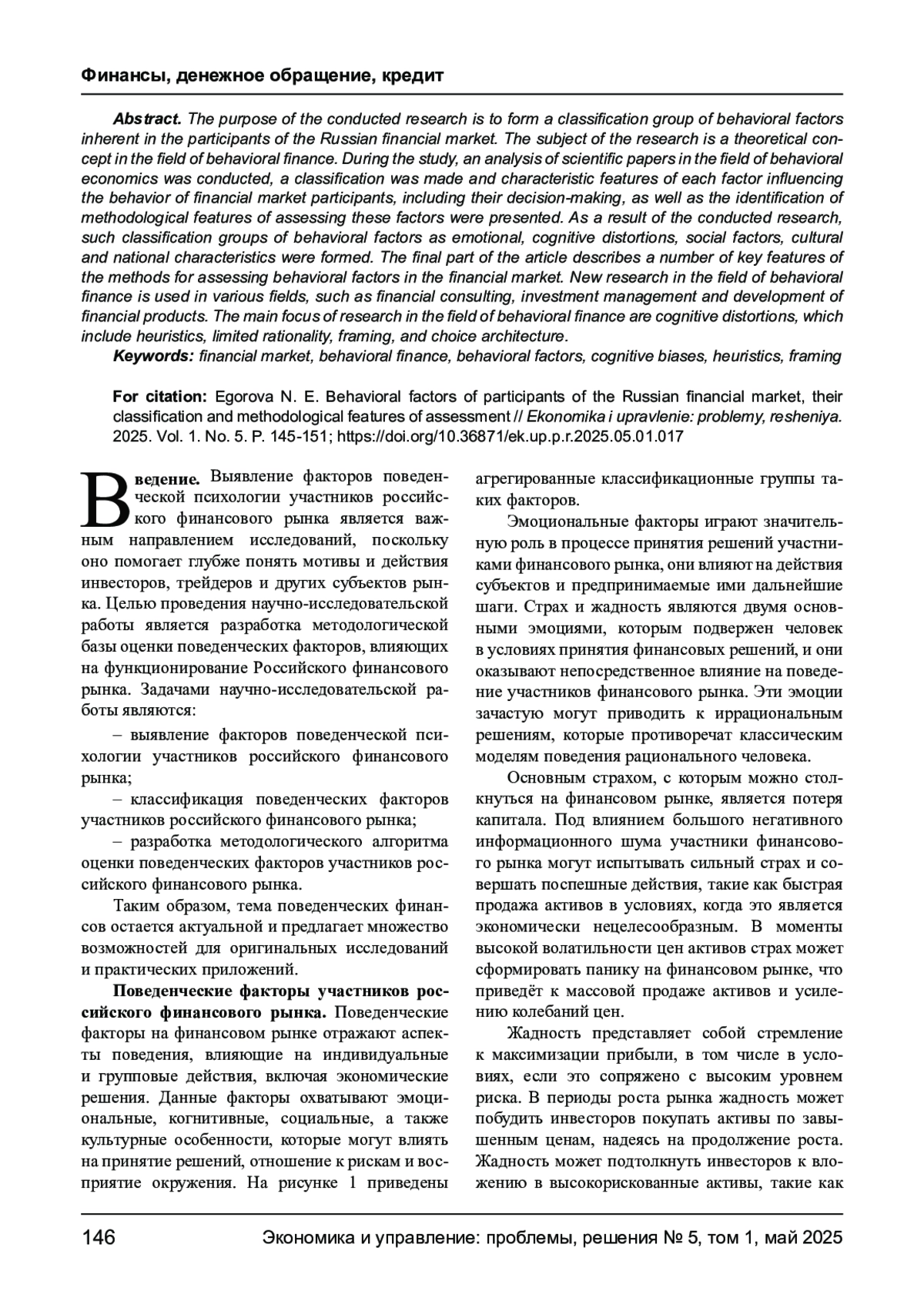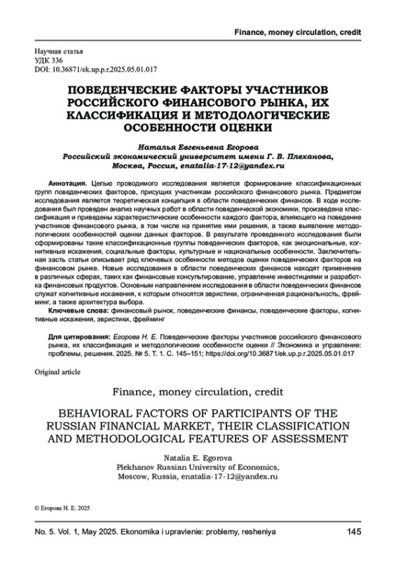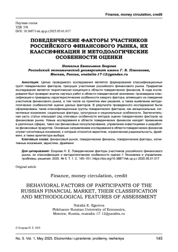 ЕГОРОВА Н. Е. ПОВЕДЕНЧЕСКИЕ ФАКТОРЫ УЧАСТНИКОВ РОССИЙСКОГО ФИНАНСОВОГО РЫНКА, ИХ КЛАССИФИКАЦИЯ И МЕТОДОЛОГИЧЕСКИЕ ОСОБЕННОСТИ ОЦЕНКИ // ЭКОНОМИКА И УПРАВЛЕНИЕ: ПРОБЛЕМЫ, РЕШЕНИЯ. 2025. ТОМ 1 № 5