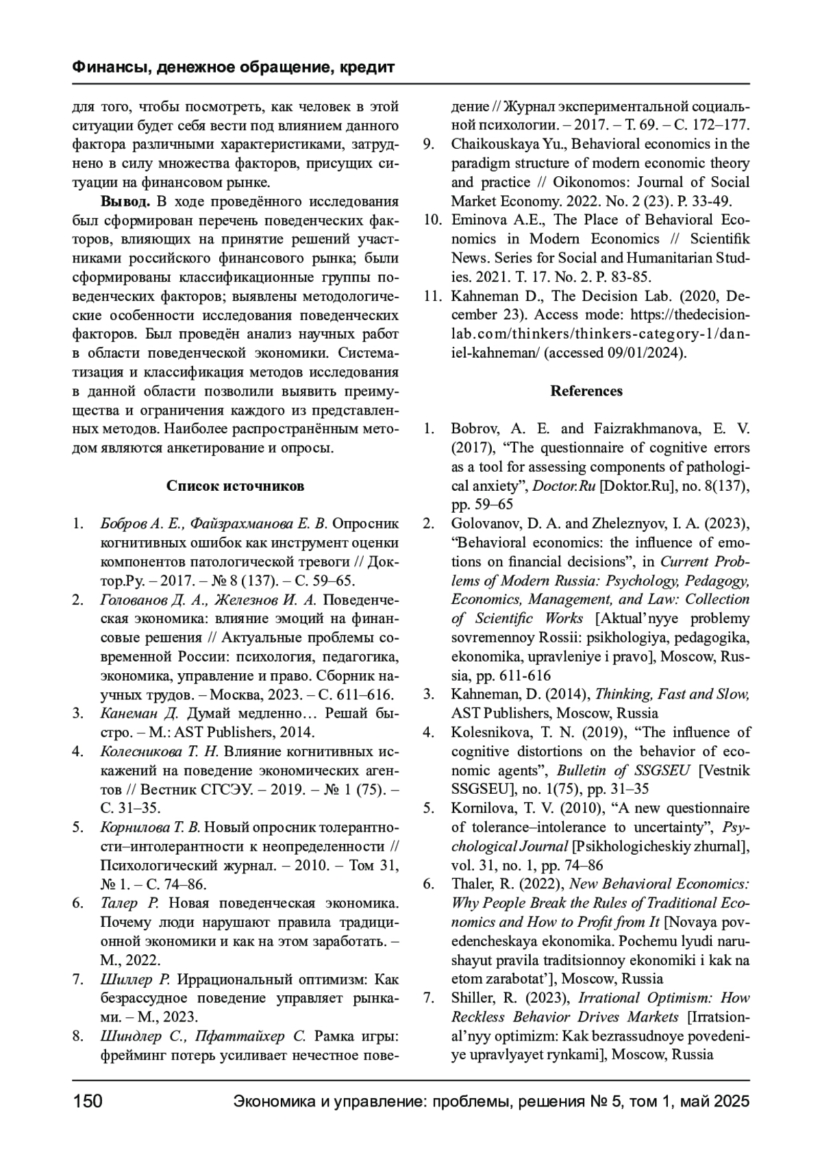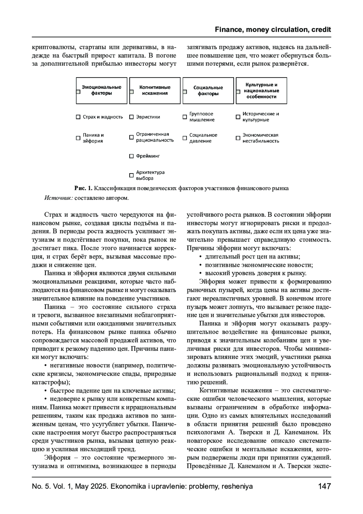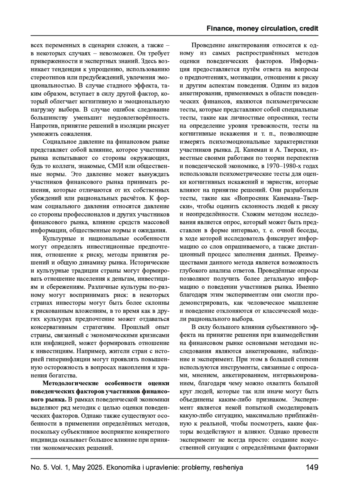 ЕГОРОВА Н. Е. ПОВЕДЕНЧЕСКИЕ ФАКТОРЫ УЧАСТНИКОВ РОССИЙСКОГО ФИНАНСОВОГО РЫНКА, ИХ КЛАССИФИКАЦИЯ И МЕТОДОЛОГИЧЕСКИЕ ОСОБЕННОСТИ ОЦЕНКИ // ЭКОНОМИКА И УПРАВЛЕНИЕ: ПРОБЛЕМЫ, РЕШЕНИЯ. 2025. ТОМ 1 № 5