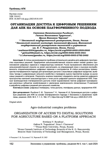 Статья посвящена анализу современных тенденций цифровой трансформации сельского хозяйства в Российской Федерации. Целью исследования является анализ направлений, технологий и эффектов цифровизации аграрного сектора с акцентом на повышение производственной эффективности, устойчивости и конкурентоспособности сельскохозяйственных предприятий. В работе использованы методы теоретического обобщения и сравнительного анализа научной литературы, рассмотрены практические кейсы применения цифровых решений. Авторы обобщают теоретико-методологические подходы к цифровизации, рассматривают основные технологические инструменты - облачные платформы, системы искусственного интеллекта, большие данные, дроны и роботизированные системы - и анализируют их влияние на аграрное производство. В результате исследования установлено, что цифровая трансформация обеспечивает рост урожайности, снижение издержек, оптимизацию трудозатрат, адаптацию к климатическим рискам и повышение инвестиционной привлекательности предприятий. Наряду с этим выявлены существующие проблемы цифровизации, связанные с инфраструктурными, кадровыми и финансовыми ограничениями. Работа имеет практическую значимость для формирования стратегий цифрового развития АПК и рекомендуется для ученых, менеджеров и представителей органов власти. Особенность исследования заключается в подходе к оценке как технологических решений, так и институциональных условий цифровой трансформации сельского хозяйства.