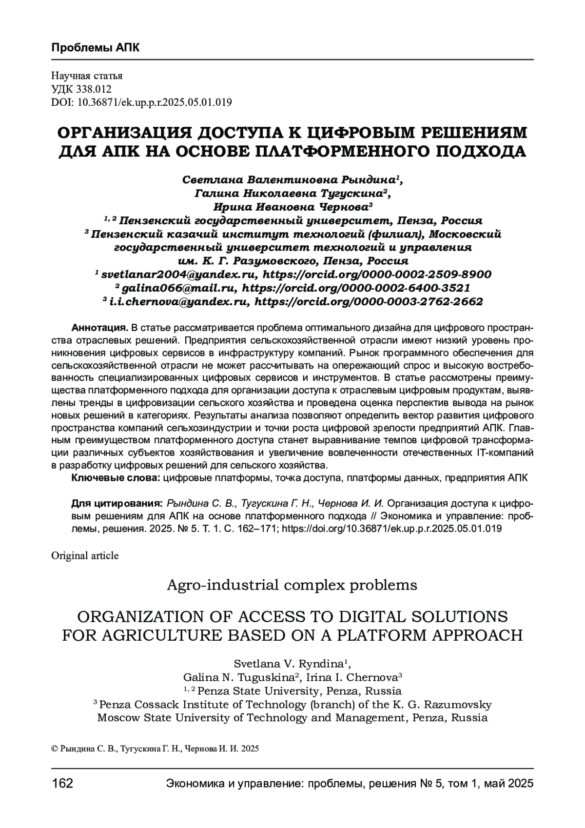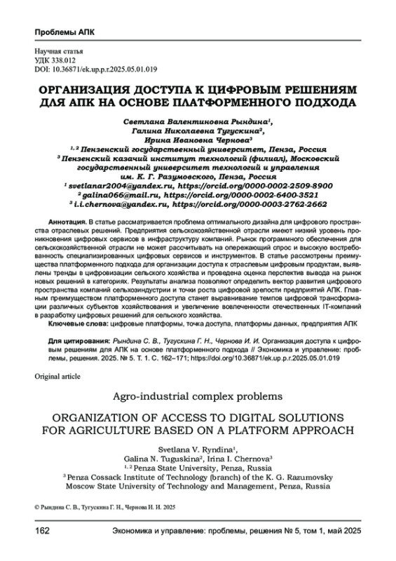 В статье рассматривается проблема оптимального дизайна для цифрового пространства отраслевых решений. Предприятия сельскохозяйственной отрасли имеют низкий уровень проникновения цифровых сервисов в инфраструктуру компаний. Рынок программного обеспечения для сельскохозяйственной отрасли не может рассчитывать на опережающий спрос и высокую востребованность специализированных цифровых сервисов и инструментов. В статье рассмотрены преимущества платформенного подхода для организации доступа к отраслевым цифровым продуктам, выявлены тренды в цифровизации сельского хозяйства и проведена оценка перспектив вывода на рынок новых решений в категориях. Результаты анализа позволяют определить вектор развития цифрового пространства компаний сельхозиндустрии и точки роста цифровой зрелости предприятий АПК. Главным преимуществом платформенного доступа станет выравнивание темпов цифровой трансформации различных субъектов хозяйствования и увеличение вовлеченности отечественных IT-компаний в разработку цифровых решений для сельского хозяйства.