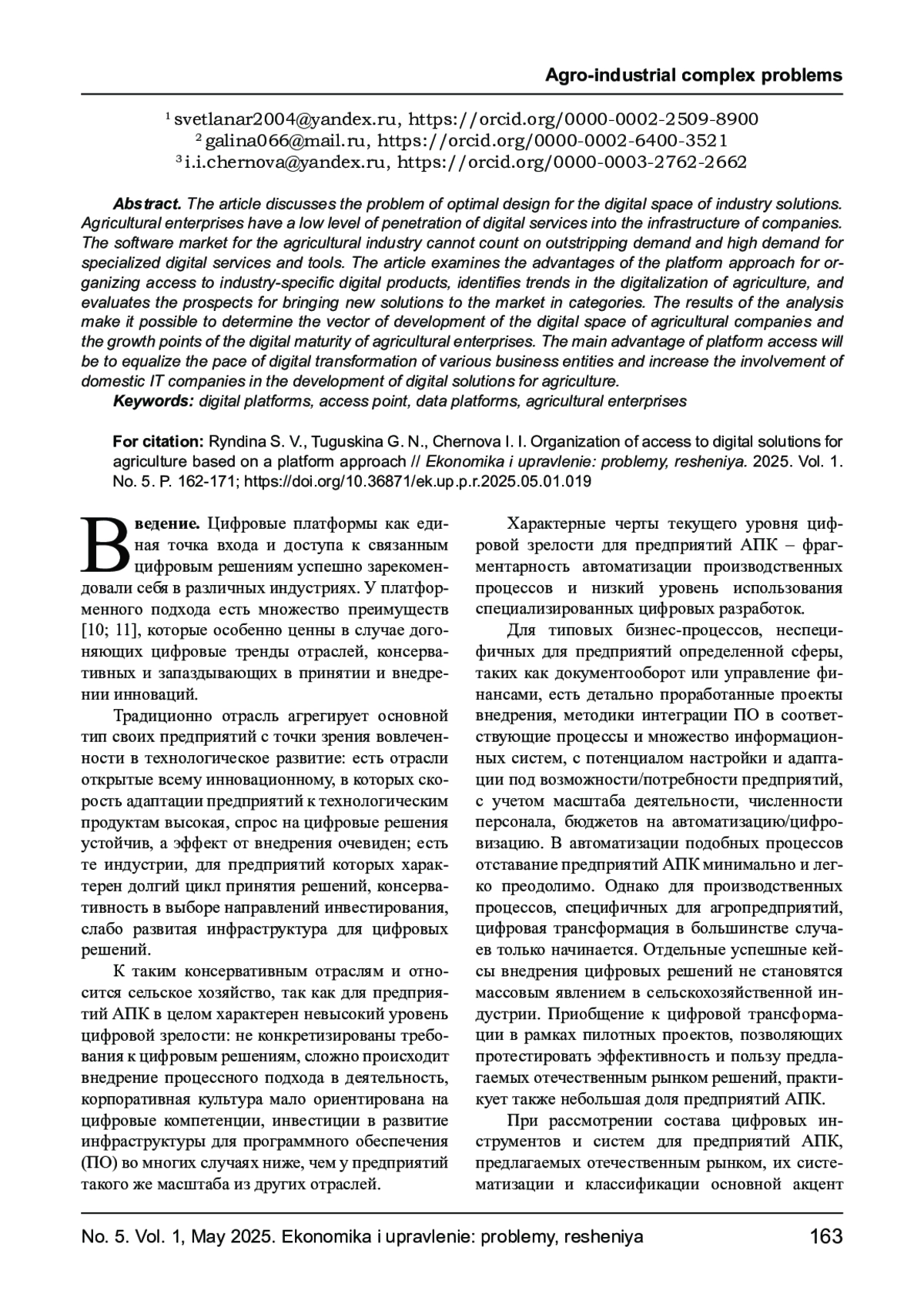 1. Абилова Е. В. Цифровые платформы в совершенствовании деятельности сельскохозяйственной кооперации / Е. В. Абилова // Общество, экономика, управление. 2023. Т. 8. № 3. С. 44-49. DOI: 10.47475/2618-9852-20238-3-44-49 EDN: ALGVVA