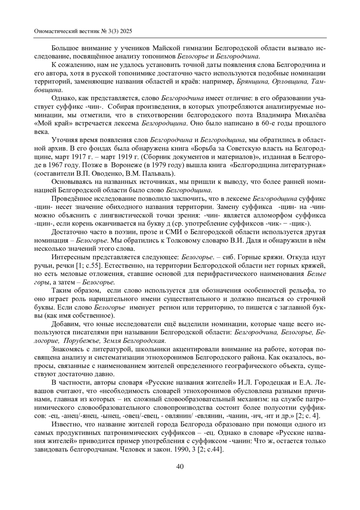 В статье исследована ценность топонимов как элемента социального и культурного пространства субъектов Российской Федерации. Сделан вывод, что значимость наименований географических объектов выходит далеко за рамки простого обозначения территориального объекта, поскольку каждое название имеет свою уникальную историю, связанную с разными аспектами жизни региона, его населением и природой. Рассмотрены функции топонимов, такие как сохранение исторической памяти, формирование региональной идентичности и поддержание межкультурных связей. Определено, что названия внутригородских районов, улиц, переулков, площадей, набережных, парков, скверов (урбанонимы) несут ценную информацию о людях, местах, важных событиях и явлениях, связанных с конкретным населенным пунктом (ул. Загоровского, ул. Платонова, ул. Тулебердиева). Показано особое значение героических топонимов. Подчеркнута роль топонимов в устном народном творчестве (топонимические тексты – легенды и предания, которые зачастую содержат значительную долю фантазии), приведены примеры местных легенд и фольклорных произведений, построенных вокруг конкретных географических названий (Илья Муромец, Муромская дорожка). Значение локальных топонимов выходит далеко за пределы простого обозначения места проживания, их использование формирует устойчивые образы и представления о регионе среди самих жителей и гостей. Акцентируется внимание на значимости исследования топонимии для понимания процессов социальной адаптации, самоидентификации и культурных взаимодействий в регионах России, в связи с чем изучение и сохранение топонимов должно стать важной задачей не только ученых-гуманитариев, но и государственных органов.